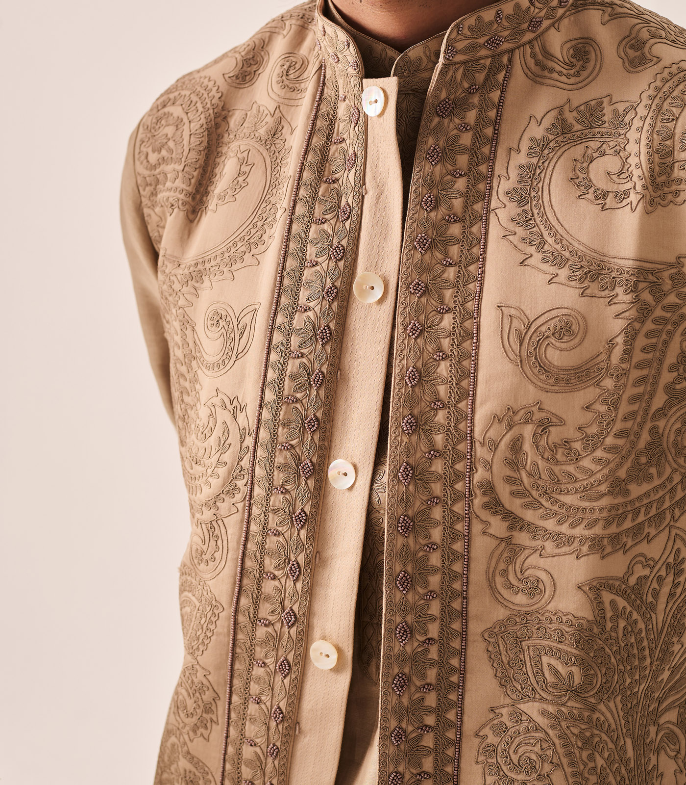 Kurta With Pants and Bundi / Chanderi / Dark Beige / Paisley Bageecha / Dori/Hand Embroidery