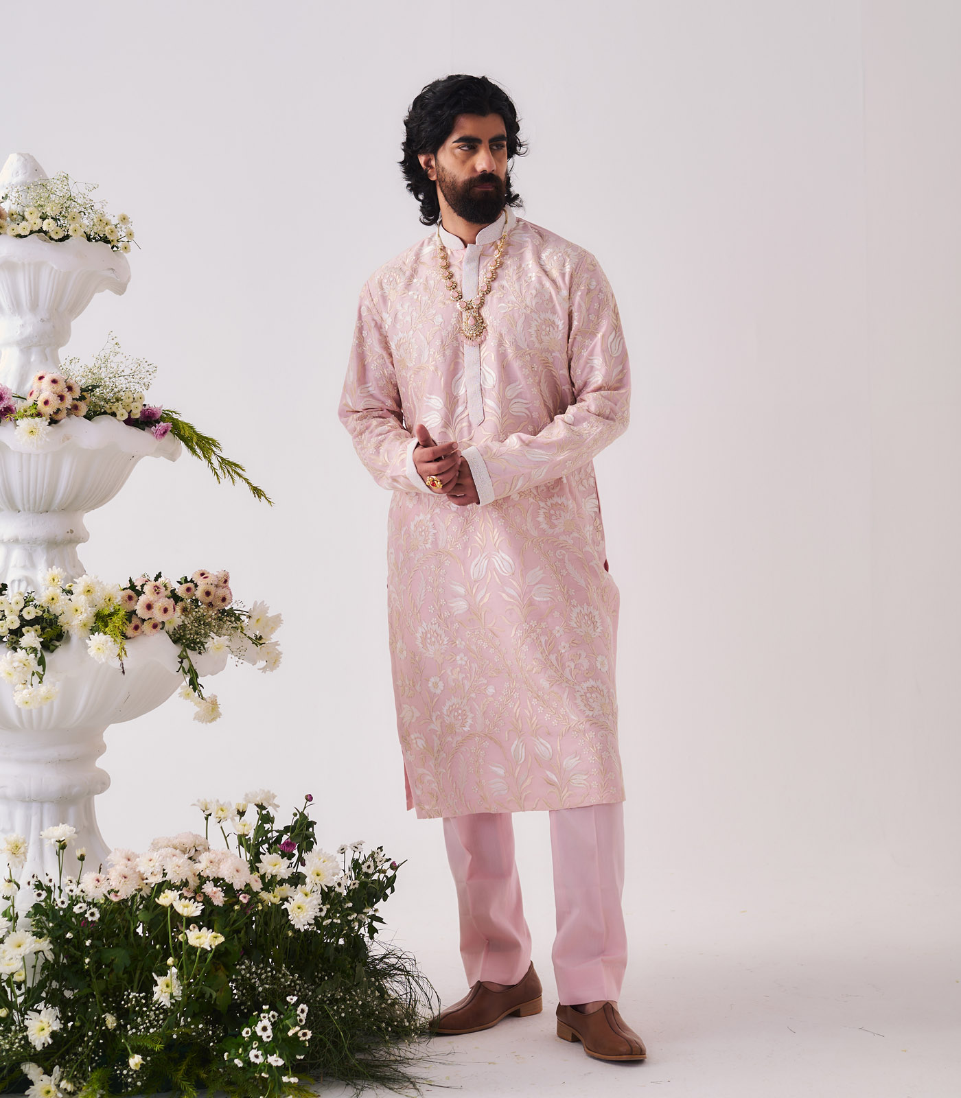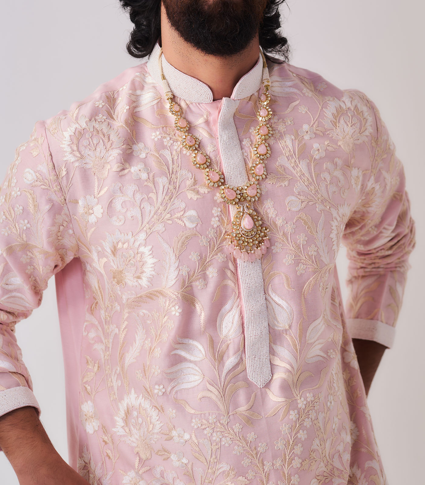 Kurta With Pants / Chanderi / Pale Pink / Tulip Meadow / Dori/Resham/Hand Embroidery