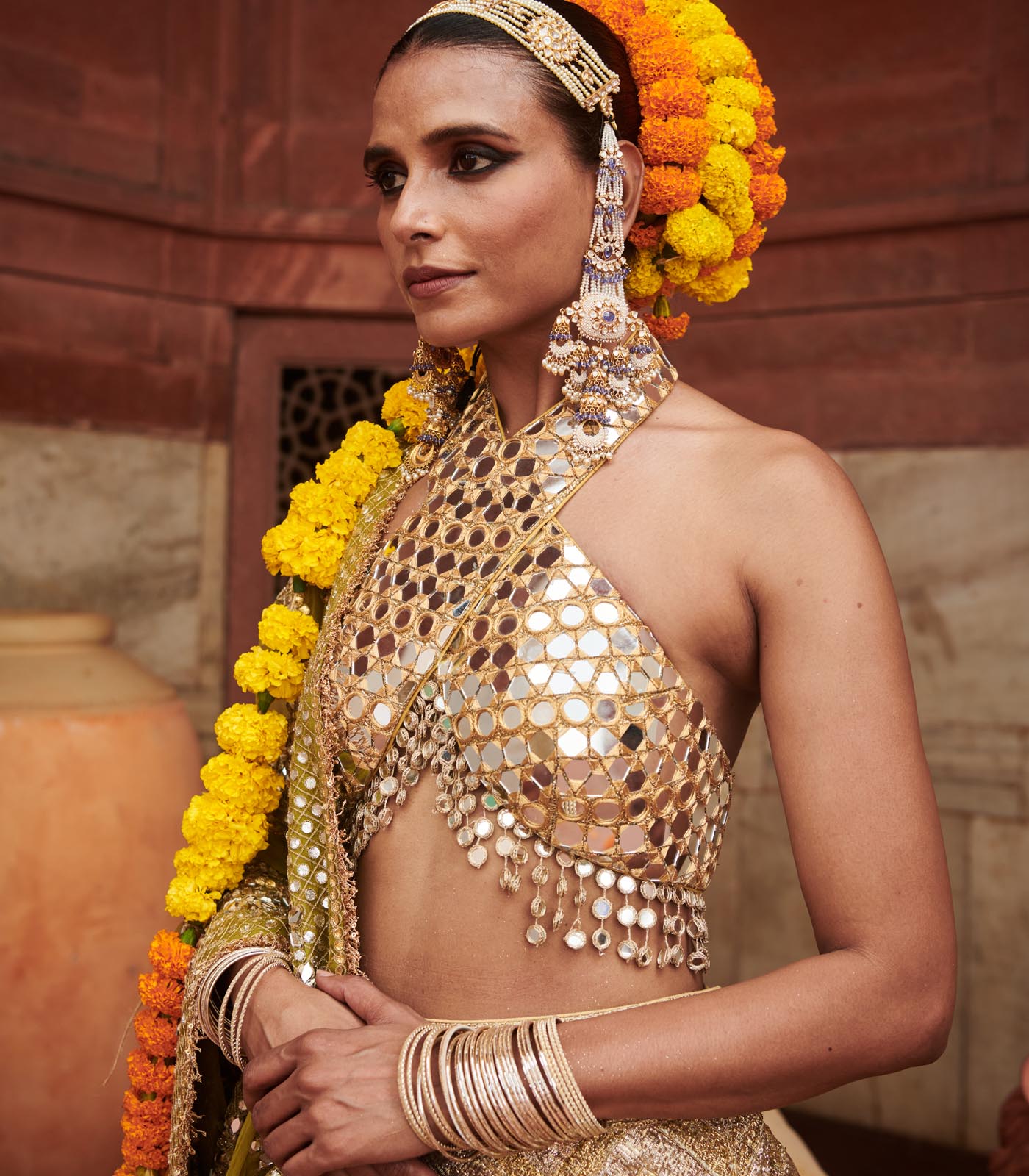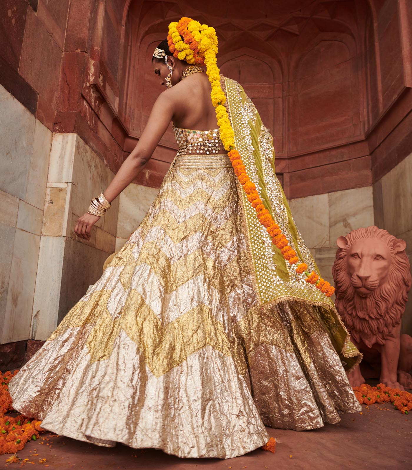 This chevron lehenga set features a striking geometric pattern with a mirror work blouse on gota lined with chanderi silk the outfit is highlighted by a vibrant green dupatta.