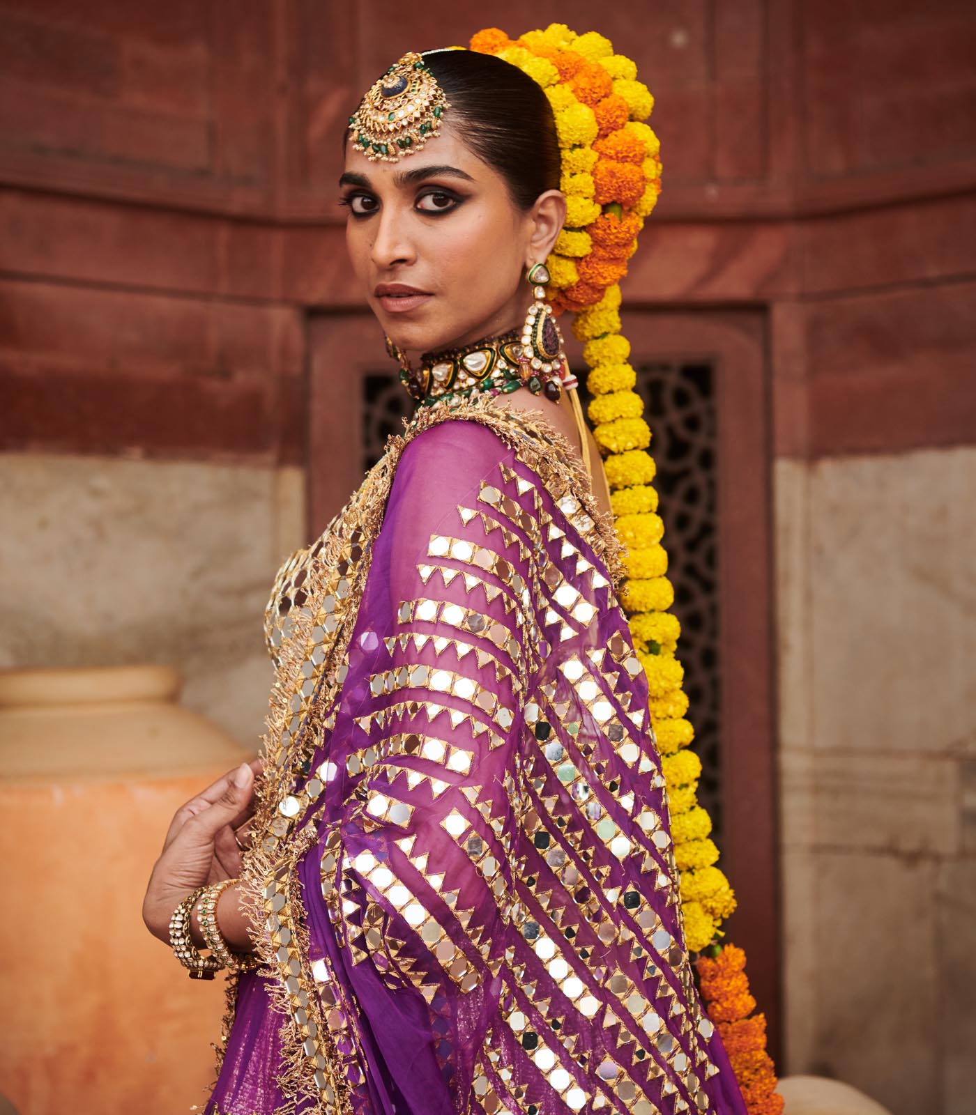 The skirt features a unique design split into two contrasting halves, silver and gold. Paired with a mirror work blouse on gota lined with chanderi silk and pop of colour is added with a purple organza dupatta.