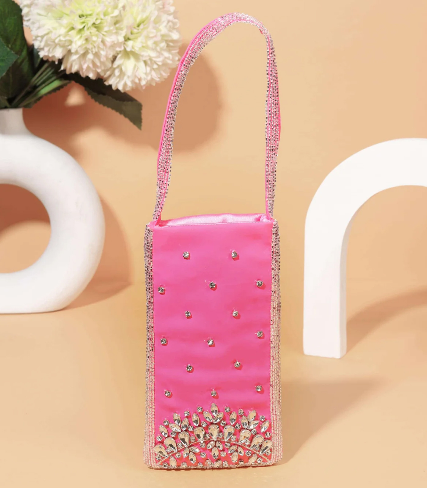 This intricate Rectangular Design Mobile Pouch highlighted with Rhinestones in a crown shape in a Stunning Hot Pink colour, adds another dimension to any outfit! This is perfect to keep any important IDs, money and your mobile!