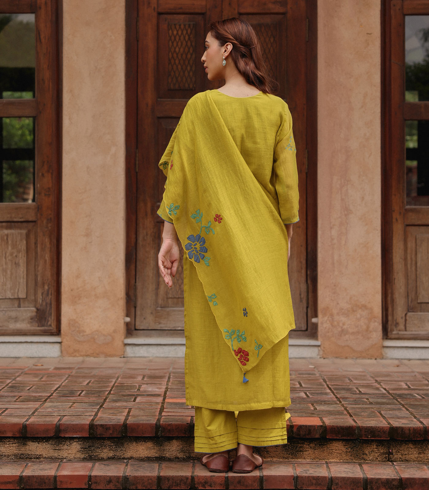 The Citrine Bloom Embroidered Kurta Set features embroidered blooms in playful hues scattered across the kurta and sleeves. Paired with coordinating pants and a dupatta adorned with applique blooms and signature tassels, it creates a breezy, festive-ready ensemble.