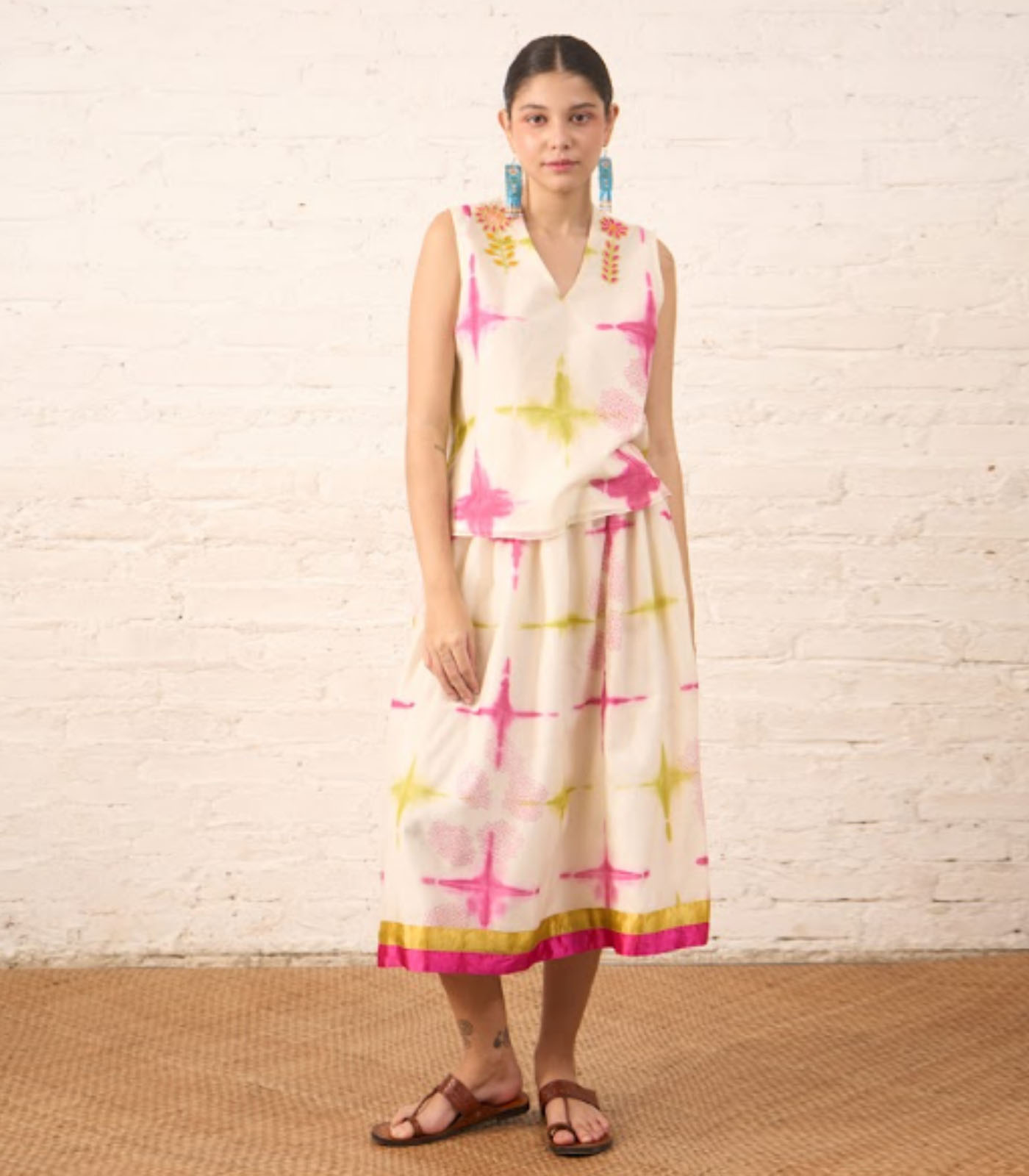 A clamping skirt top with soft pink and lime accents, crafted in lightweight silk chanderi. The relaxed silhouette and gentle sheen make it a perfect piece for effortless summer dressing.