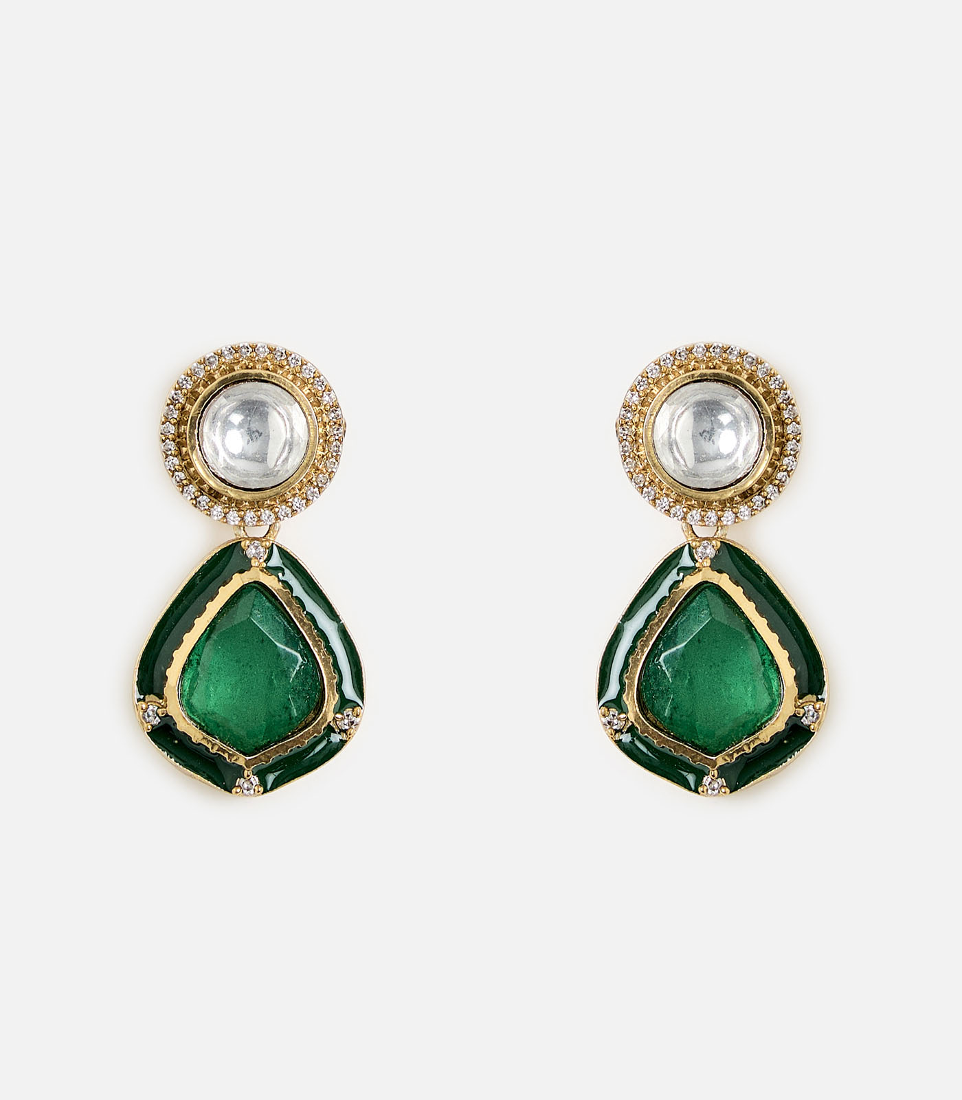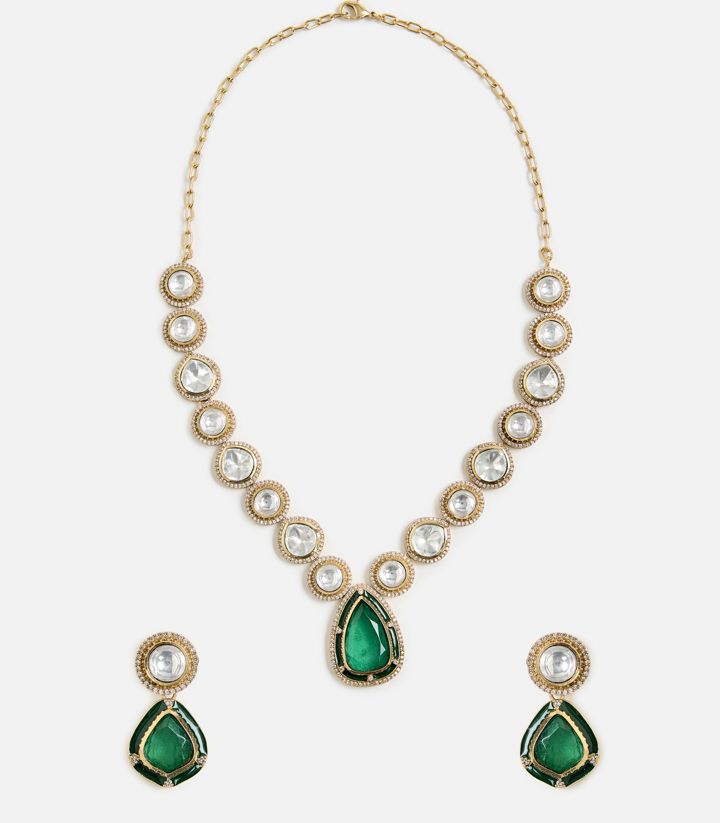 This elegant Moissanite Kundan Polki necklace set features a classic design with a green teardrop pendant and matching earrings, adding timeless charm and grace to any festive or bridal ensemble.