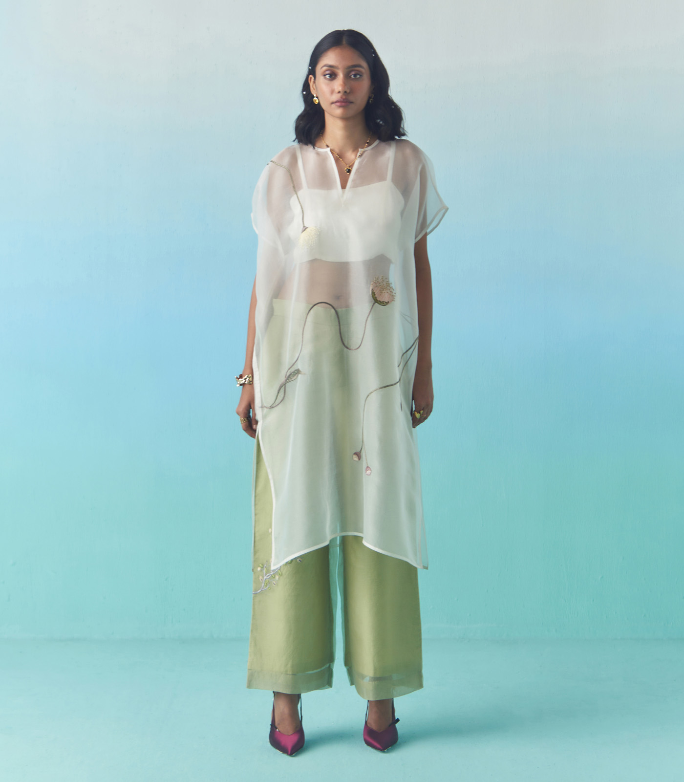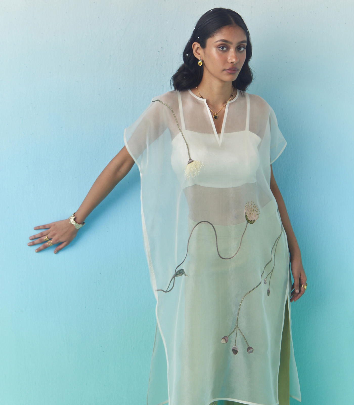 A versatile sheer kaftaan-overlay with hand embroidered contemporary motifs at the front. Comes with an option of either a long camisole or a bustier inside.