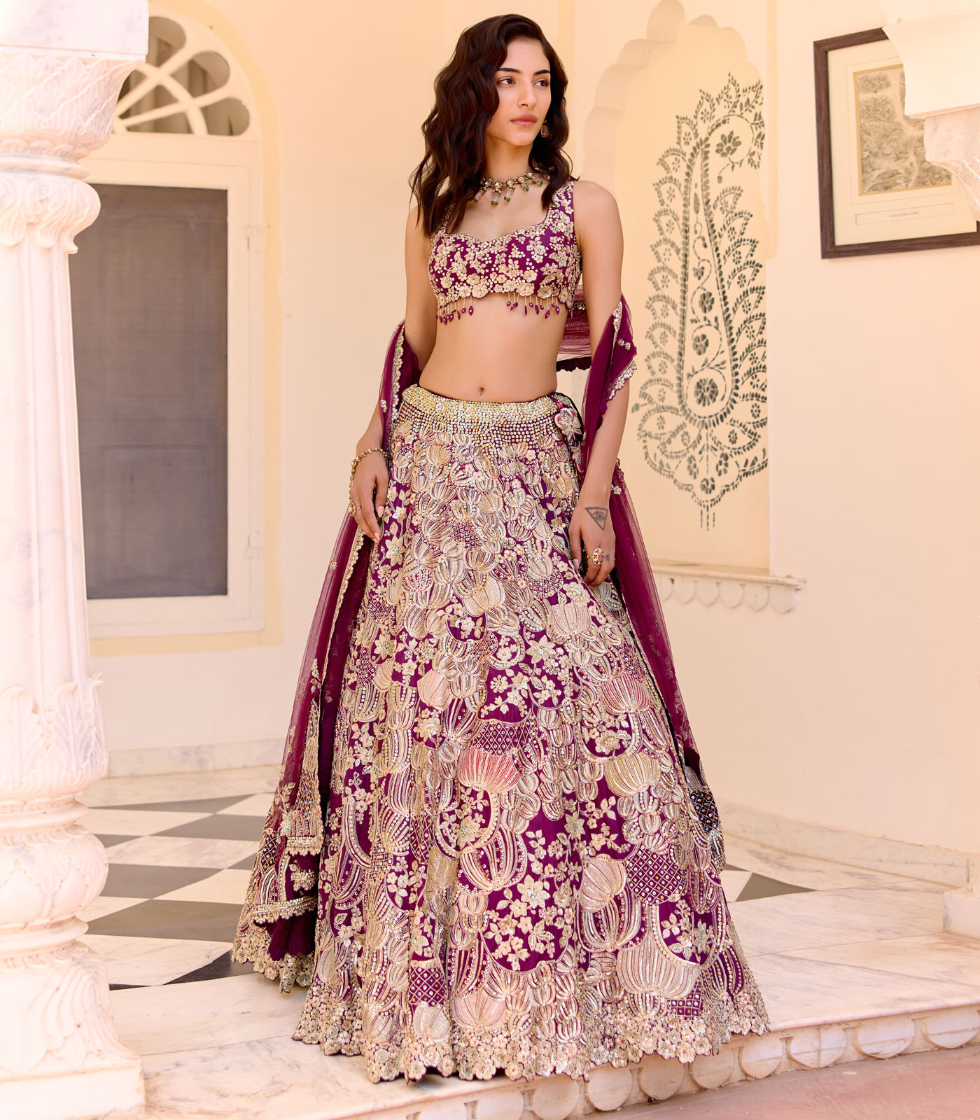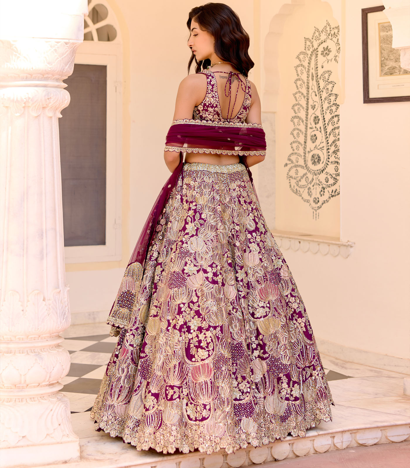 The set is handcrafted with zardozi, french knots, aari work and applique embroidery