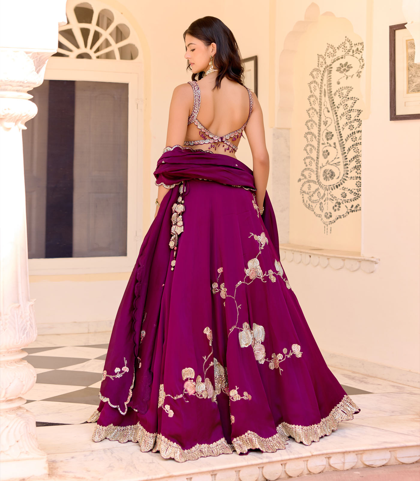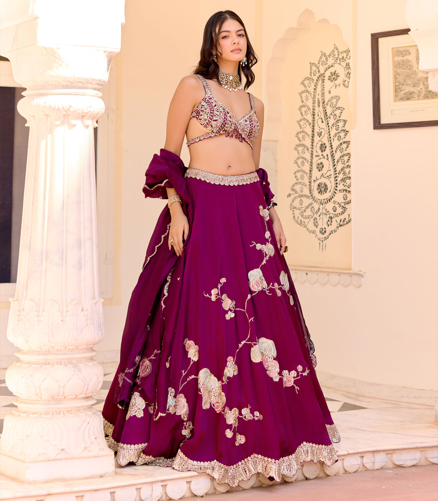 The dark plum lehenga set is handcrafted with zardozi, french knots, and aari embroidered jaal work