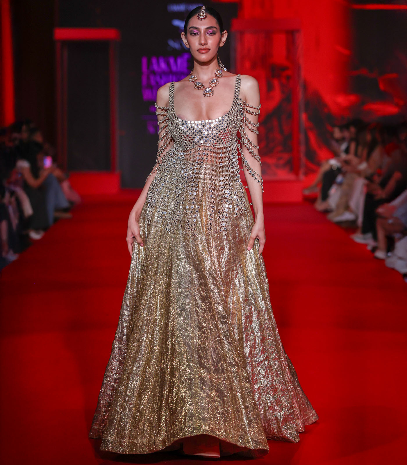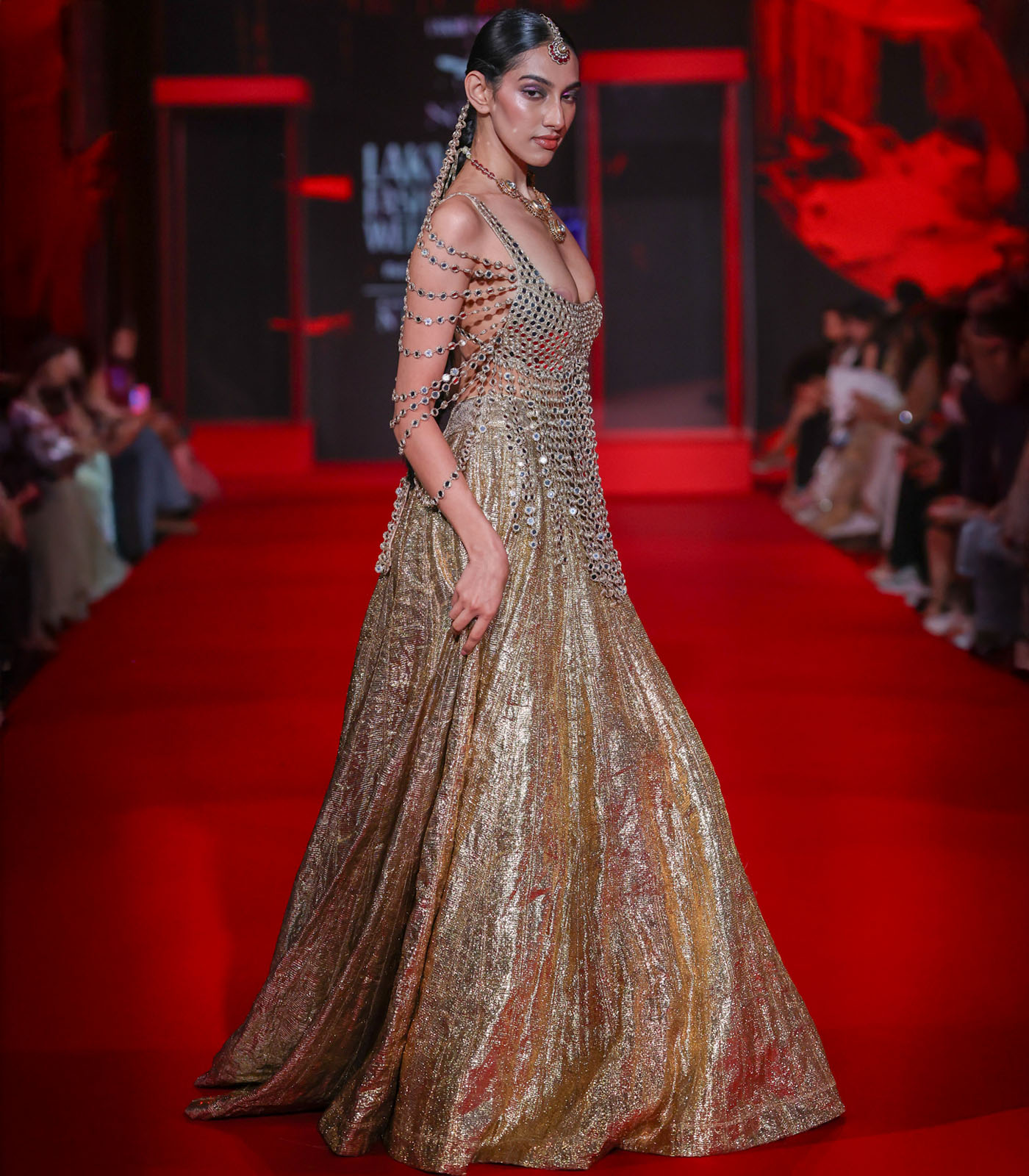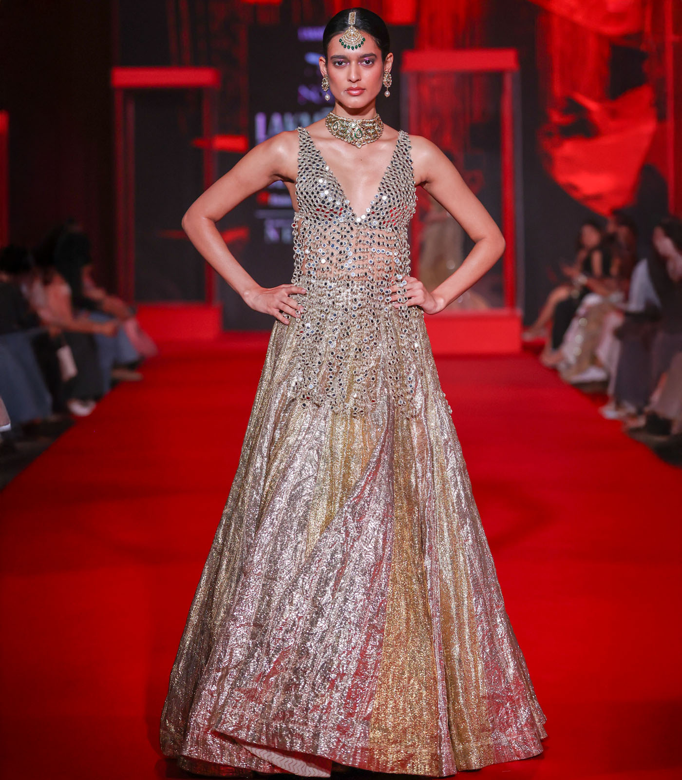 This scoop neck mirror work blouse features statement arm hangings that drape elegantly down the back, paired with a gold lampi lehenga. The intricate mirror embellishments and cascading arm hangings create a dramatic statement piece perfect for weddings and festive occasions.