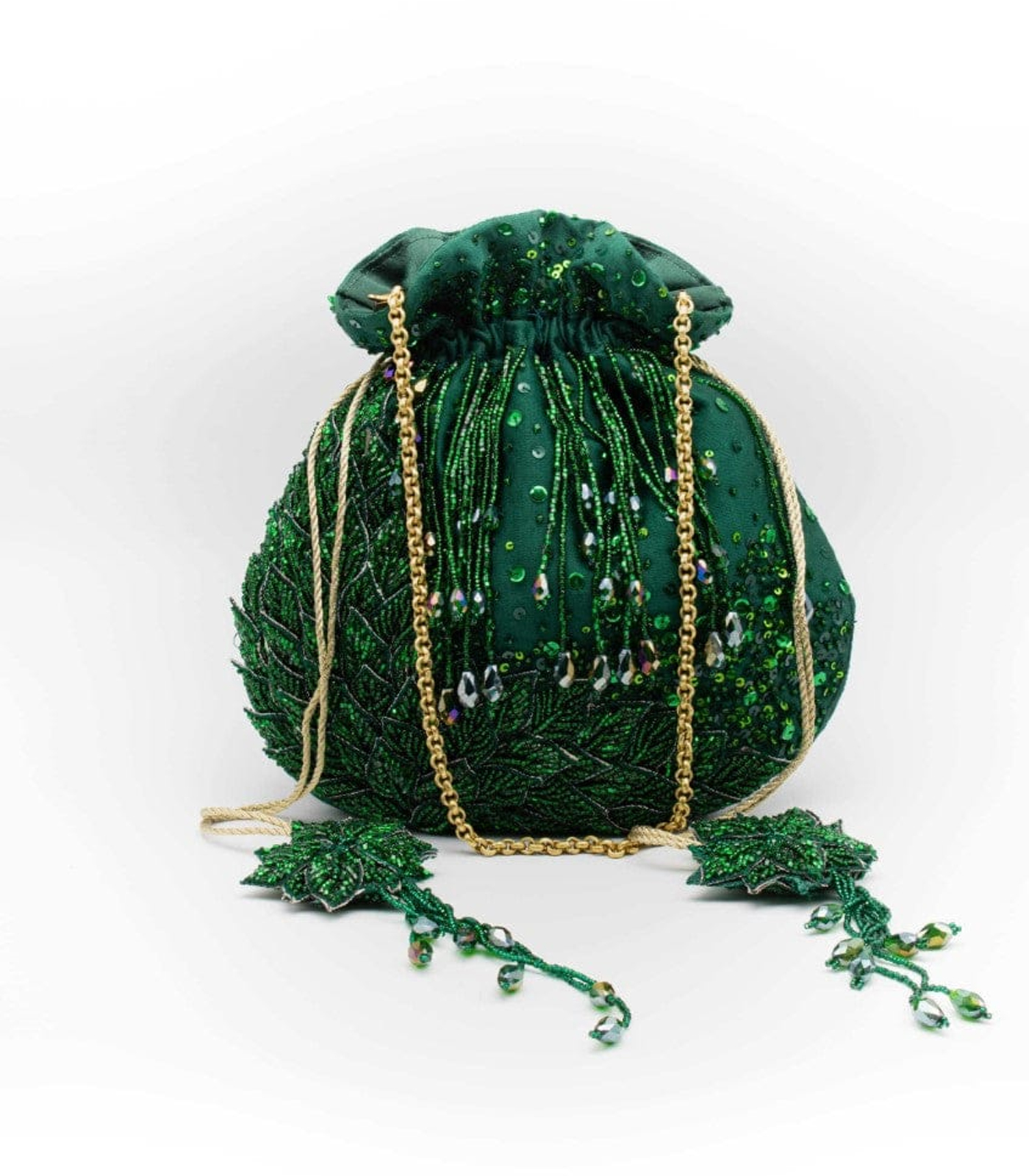 Intricate Applique Green Leaf Work in the Corners is what makes this Potli a dream come true! Designed with Sequins and Kathdana Bead Work, and tassels of beads and crystals that shimmy when you walk, or dance! This stunning Green Potli is all you need for your next Festive Event!