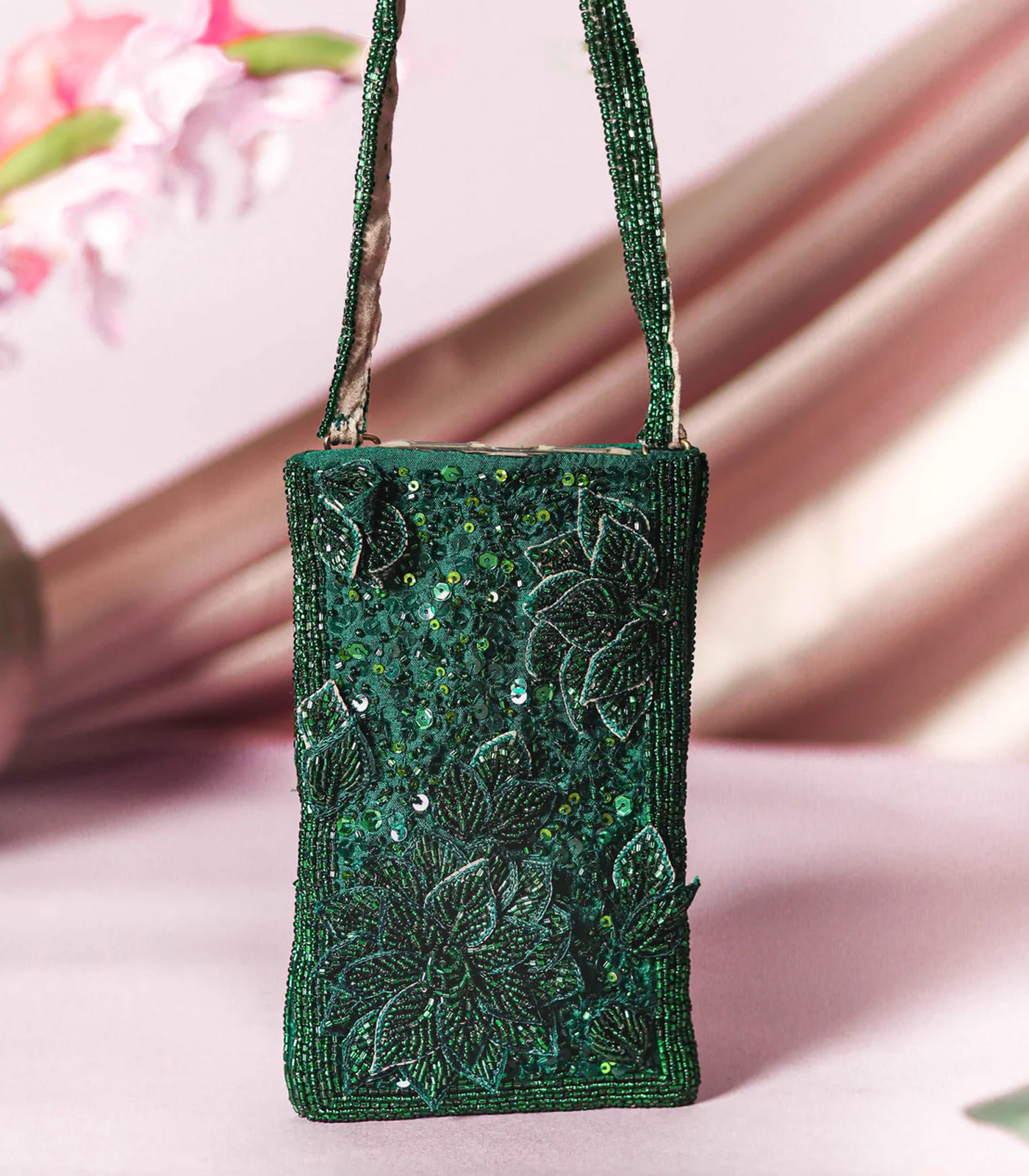 This intricate Rectangular Design Mobile Pouch with Applique leaf work arranged in corners , with sequins, and Kathdana and Bead work in a stunning Green Colour! This is perfect to keep any important IDs, money and your mobile!