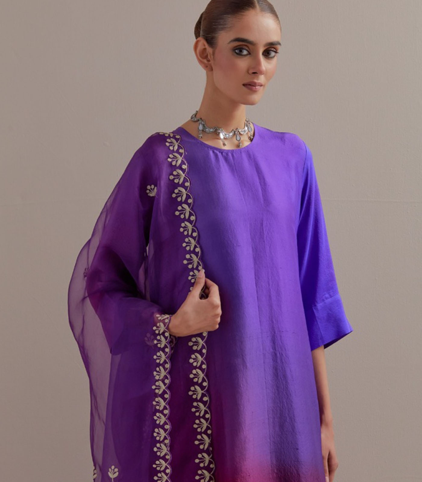 Deep purple Ombre silk kurta with scallop embroidered organza dupatta and cotton silk pants