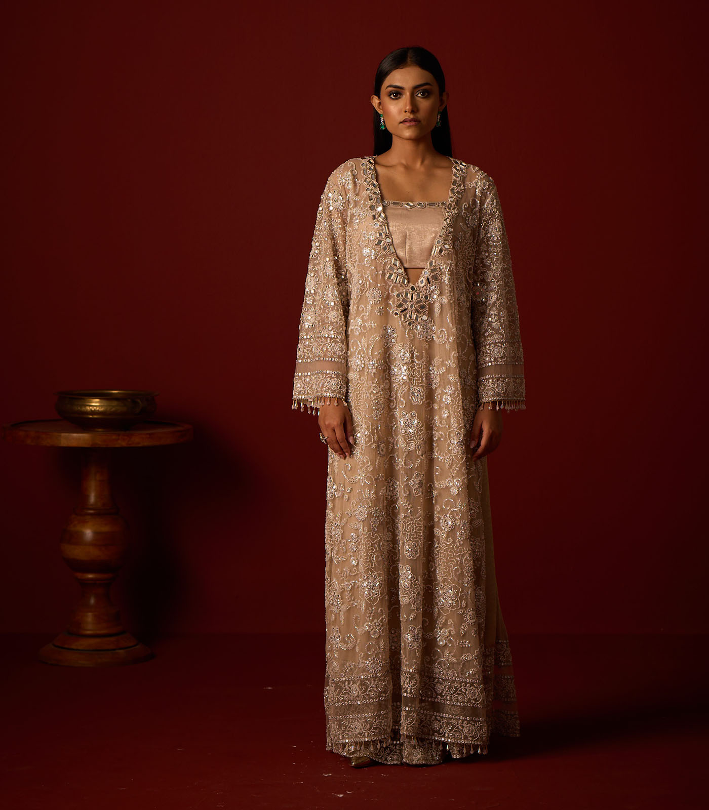 Hand Embroidery Embellished V Neck Long Slits Kaftan With Mirrorwork Beadwork Detailing On Tulle