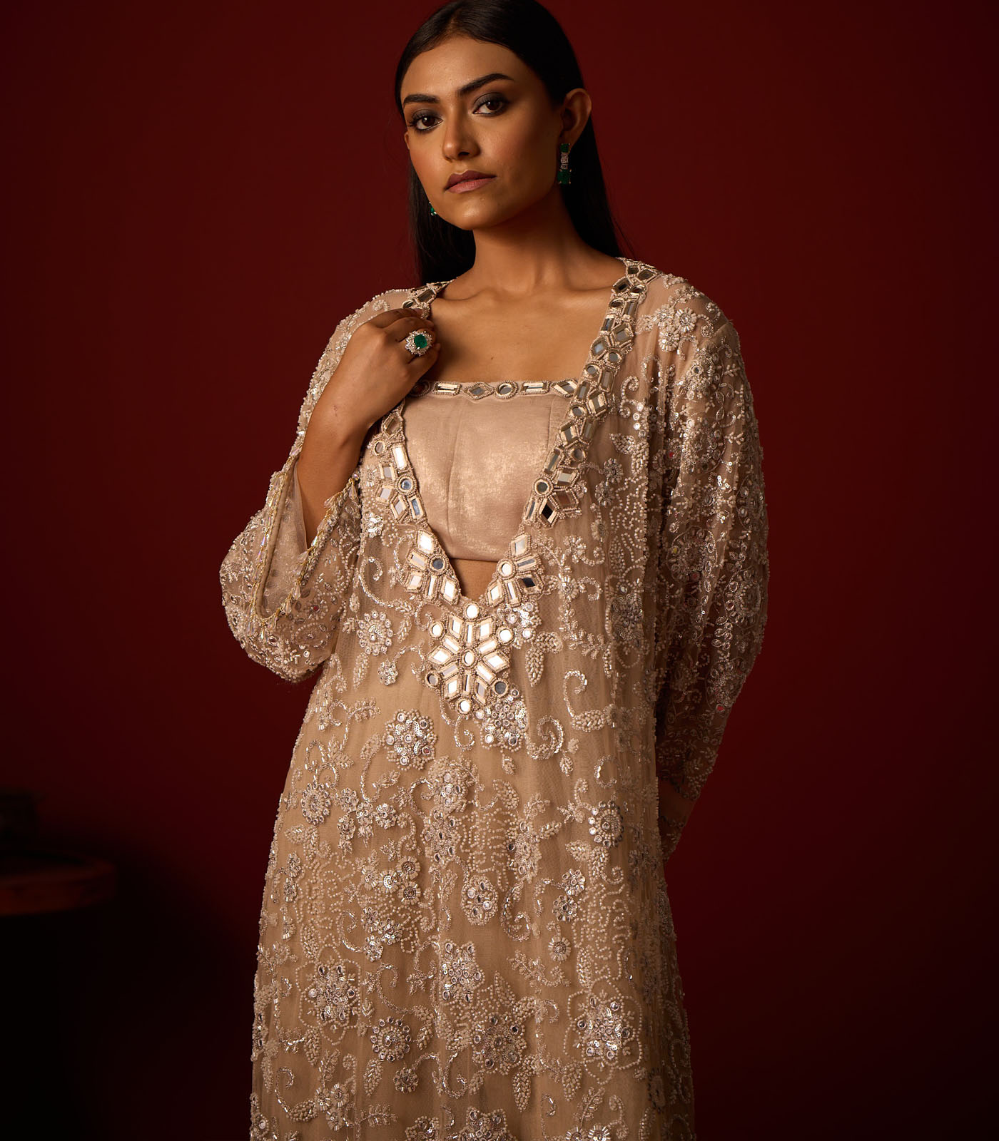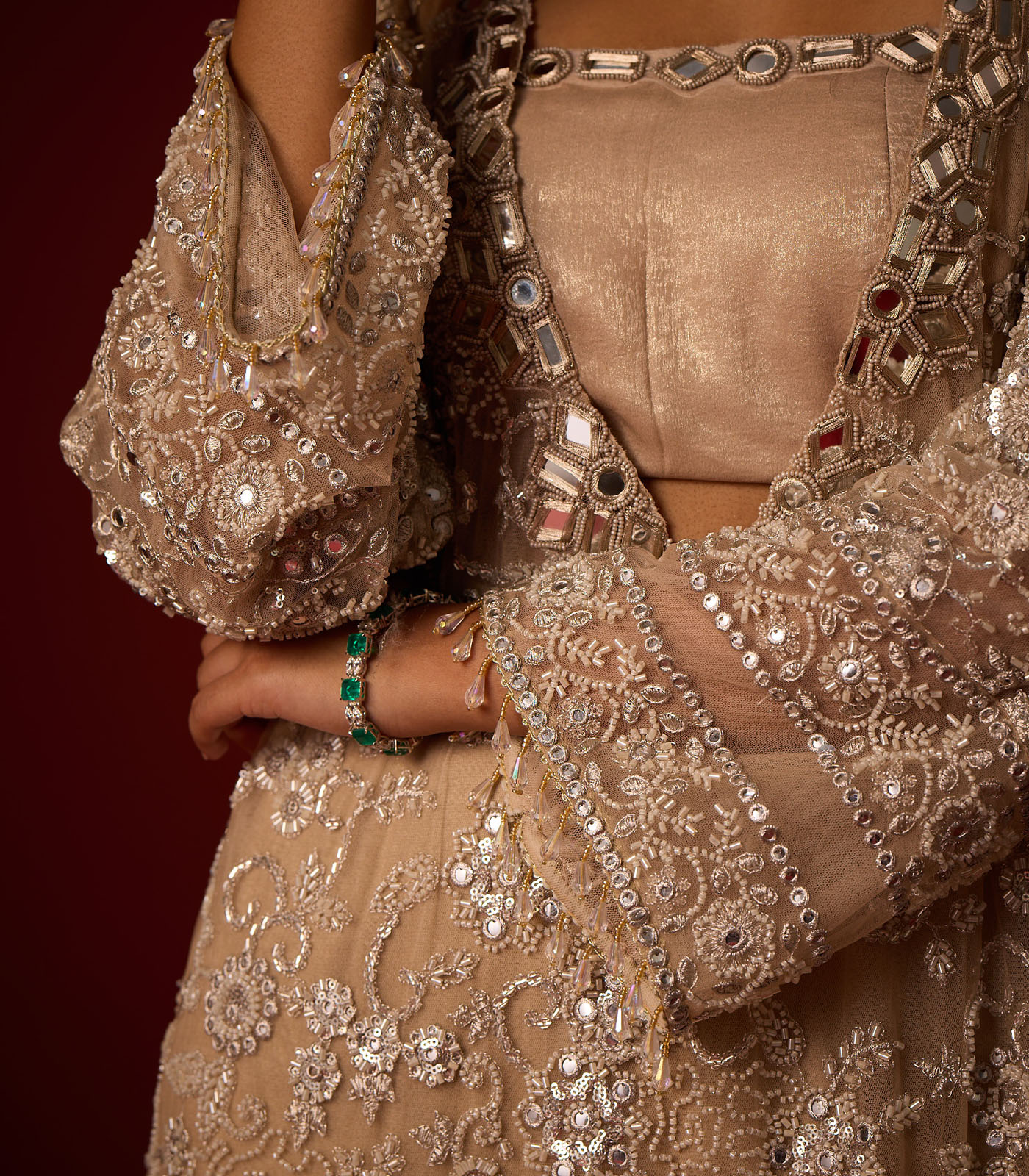 | Fabric | This mirrorwork beadwork net fabric is specially designed by our team and is crafted with great care and precision. The garment is then styled at our workshop with finest details. |