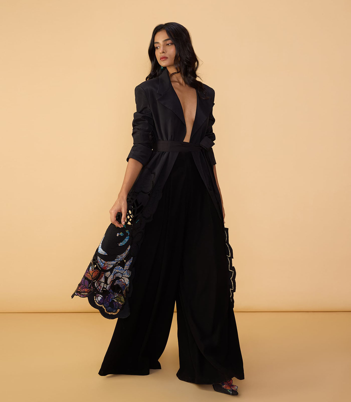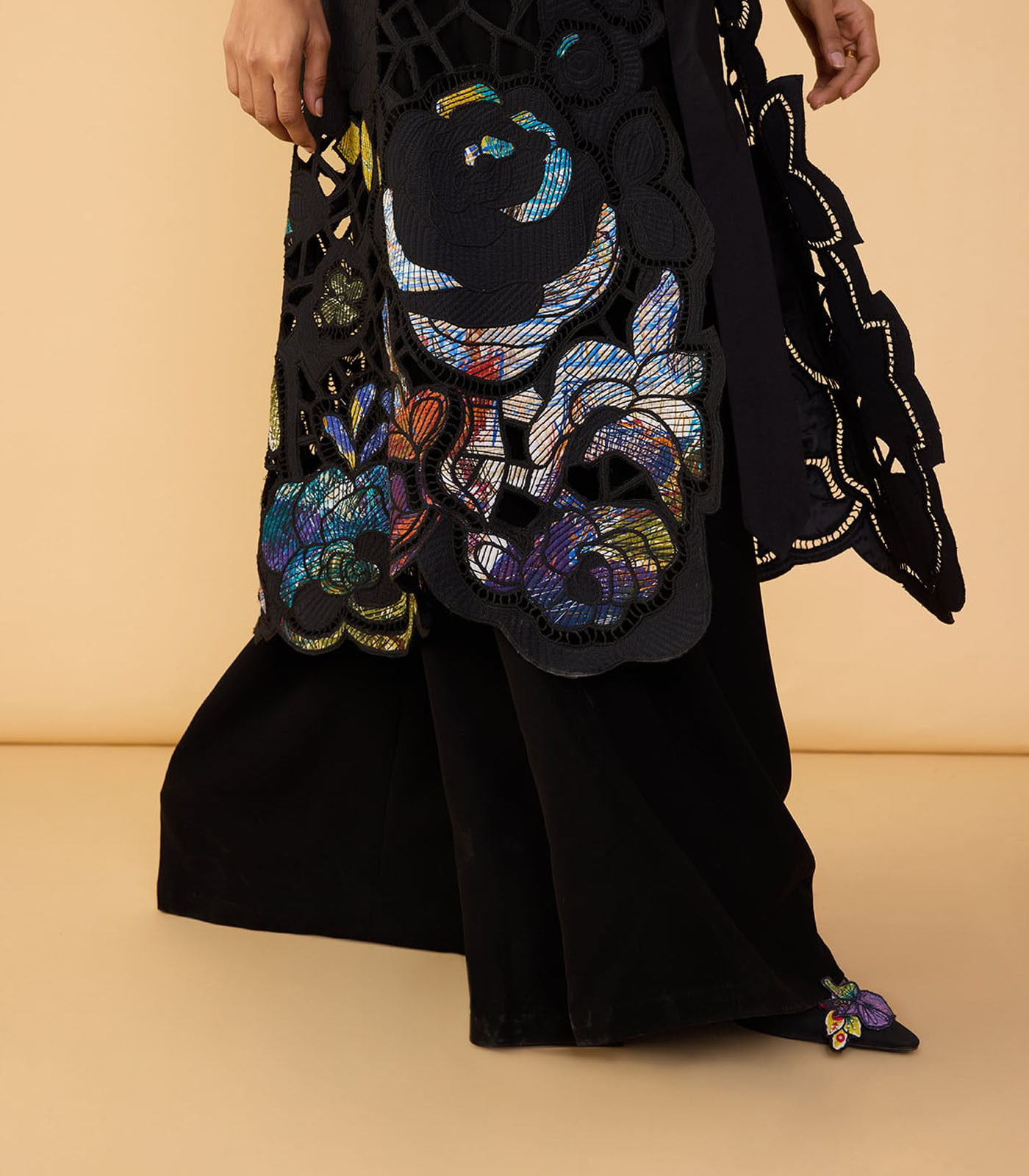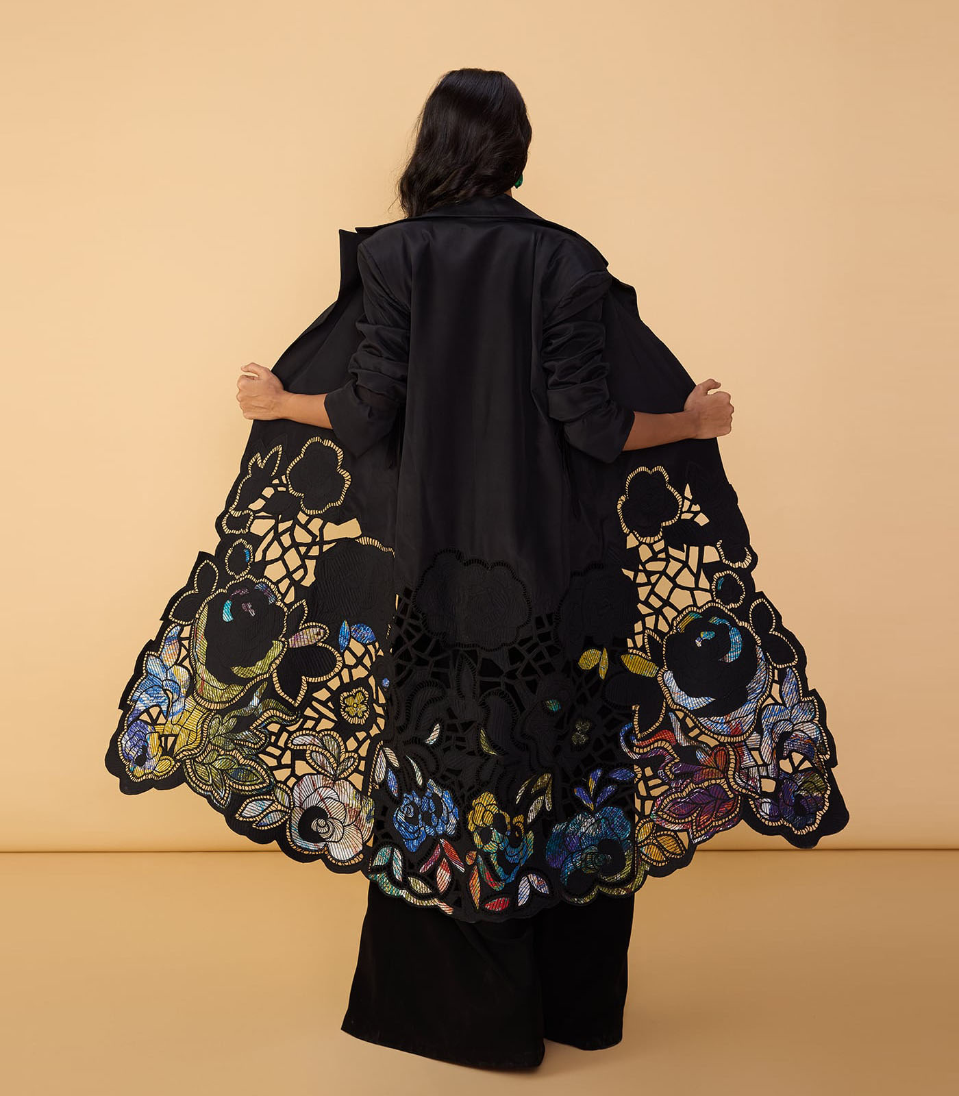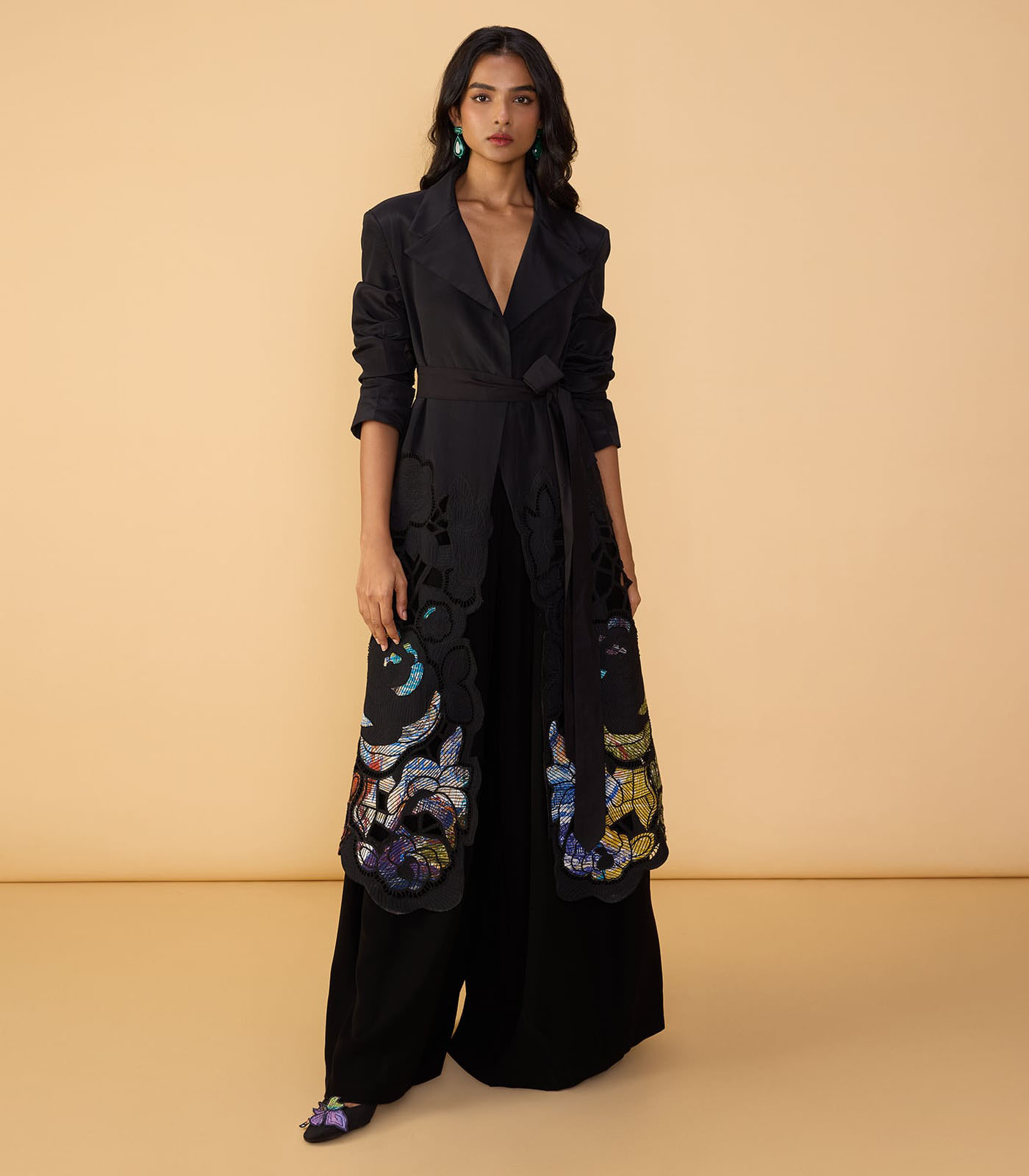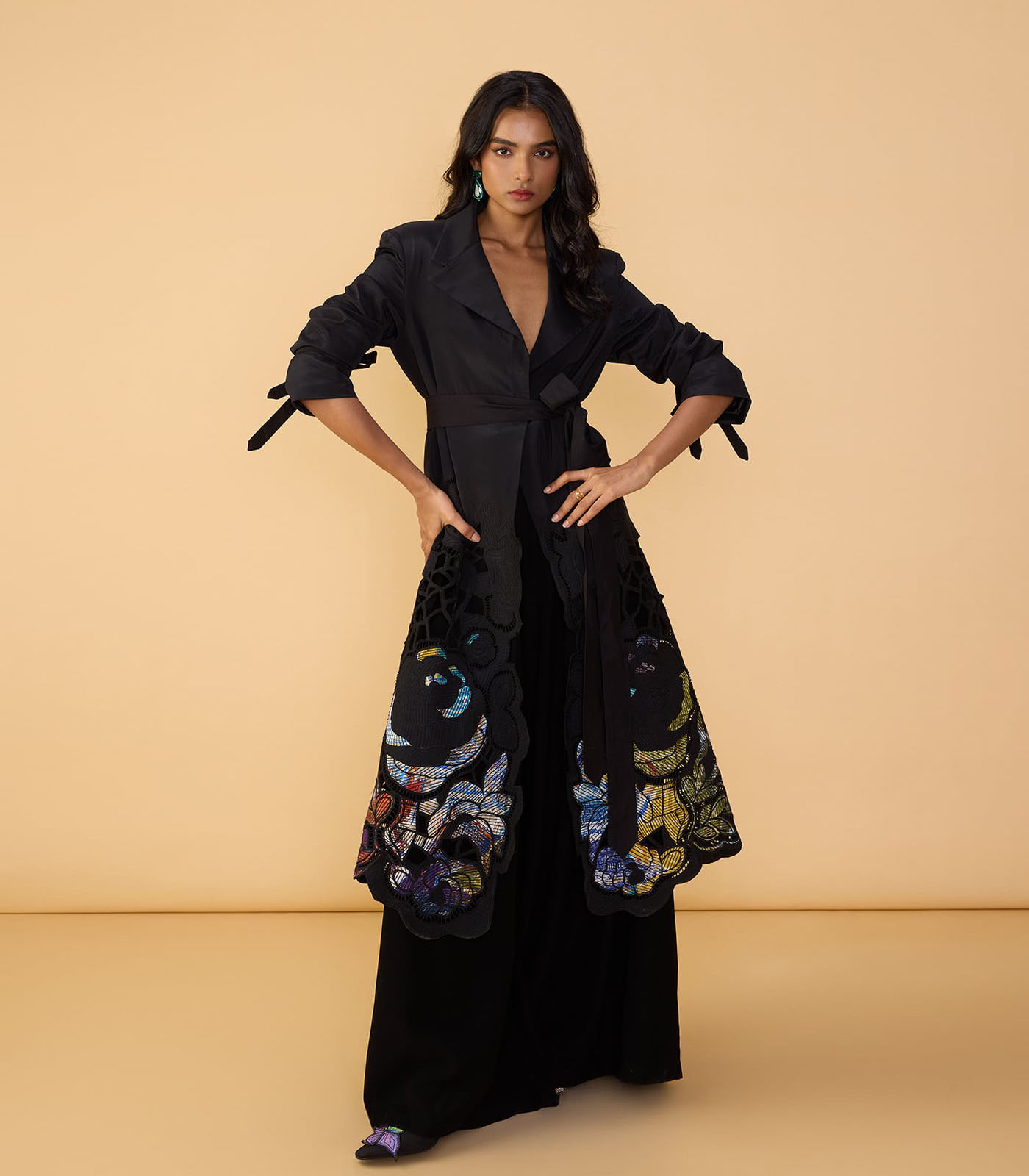 Trench : Intricate hand embroidered floral cutwork applique trench coat with detachable belt