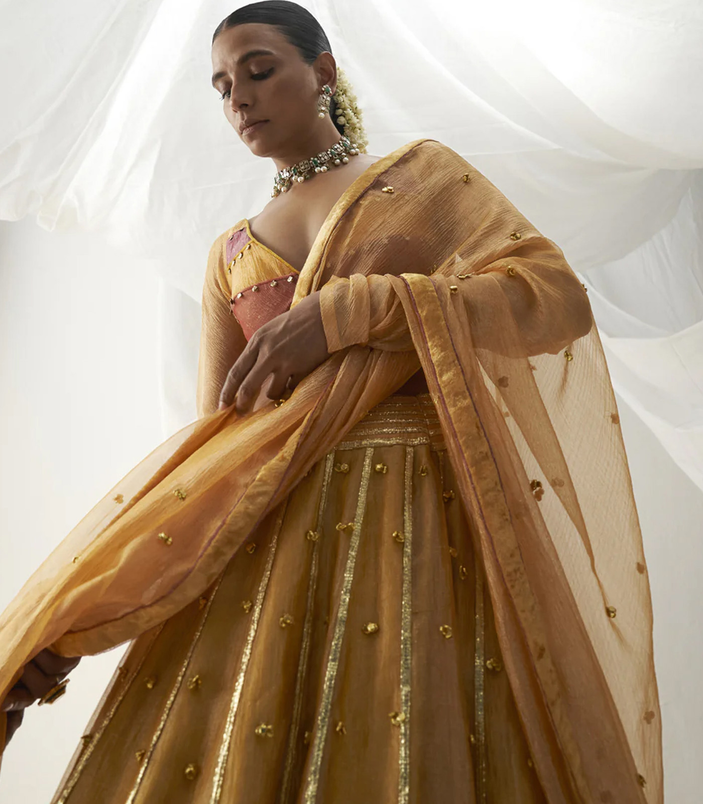Color blocked choli patterned blouse with churi sleeves and backless design paired with warm shade of mustard lehenga which has ghrunghroo sprinkling on all over and gota stripes along further paired with tissue dupatta.