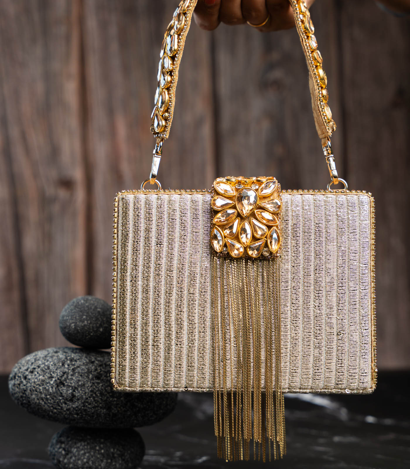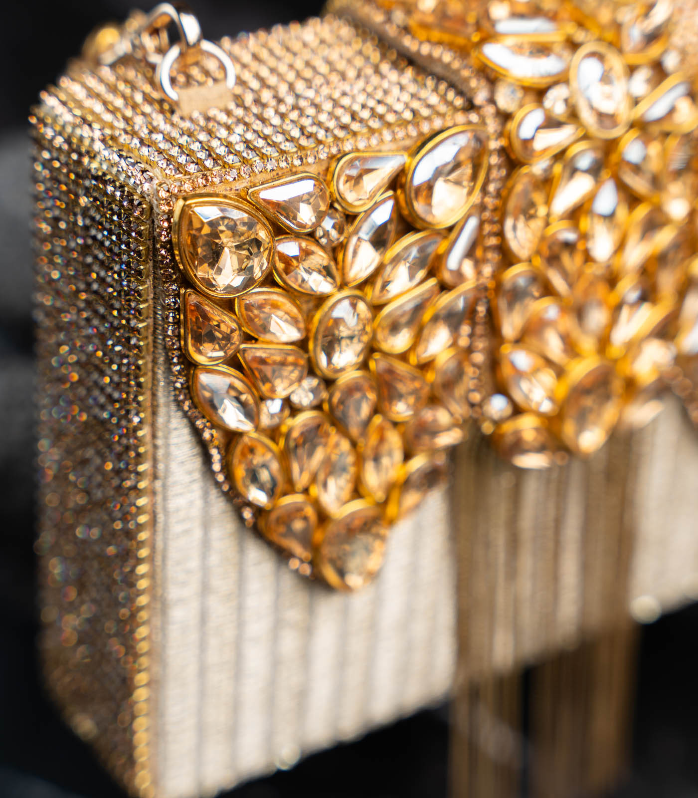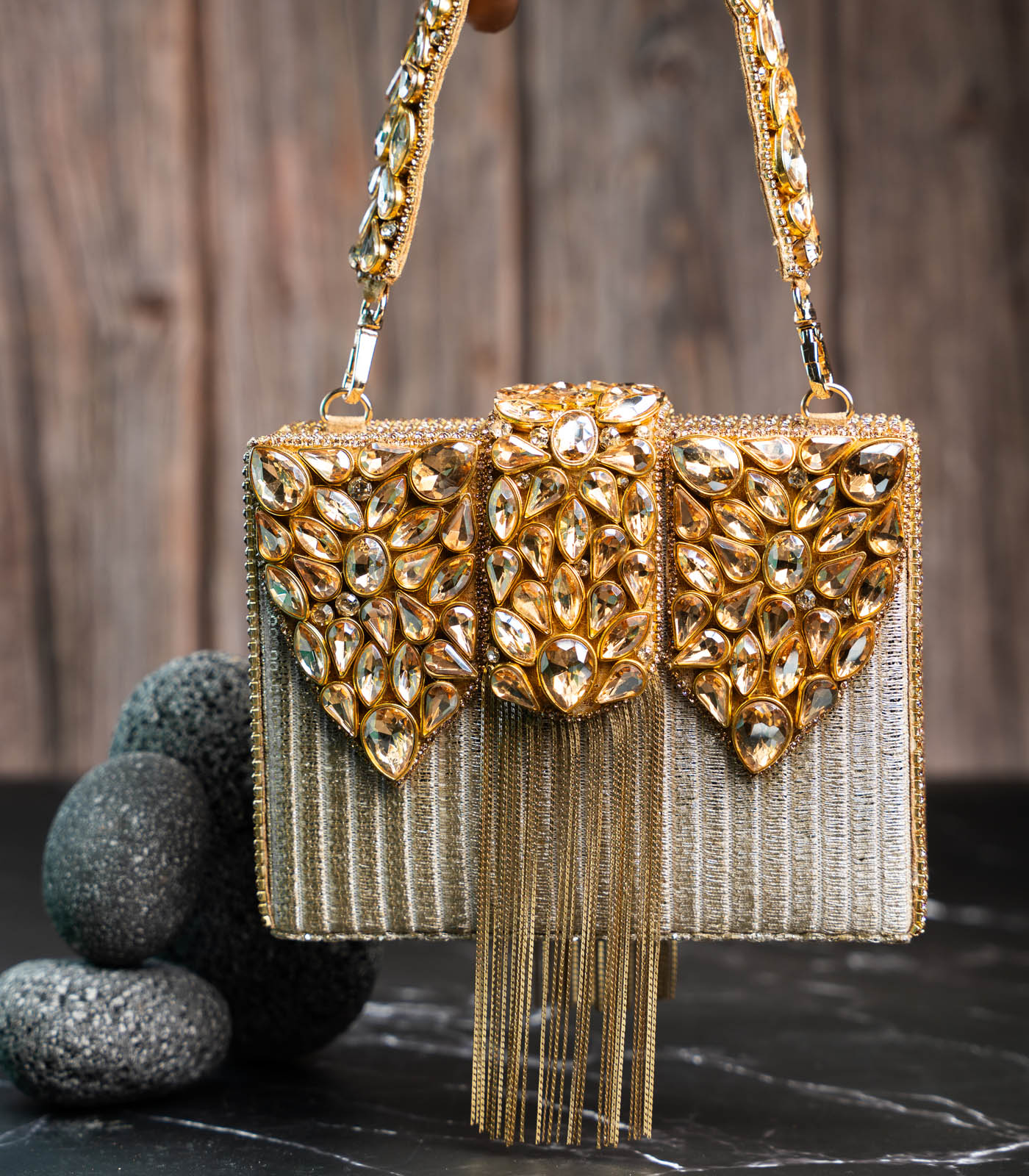 Glamour takes form in the radiant Diamond-Hinted Kasse Plume (Gold) clutch — a piece that exudes pure sophistication and charm. Crafted with a gleaming metallic base, it is lavishly embellished with clusters of golden crystals arranged in an exquisite pattern reminiscent of fine jewelry. The structured silhouette is enhanced with cascading gold chains that add a touch of fluid movement and allure. Bold yet refined, this statement clutch captures the essence of contemporary elegance, making it the perfect companion for soirées, festive occasions, and timeless celebrations.