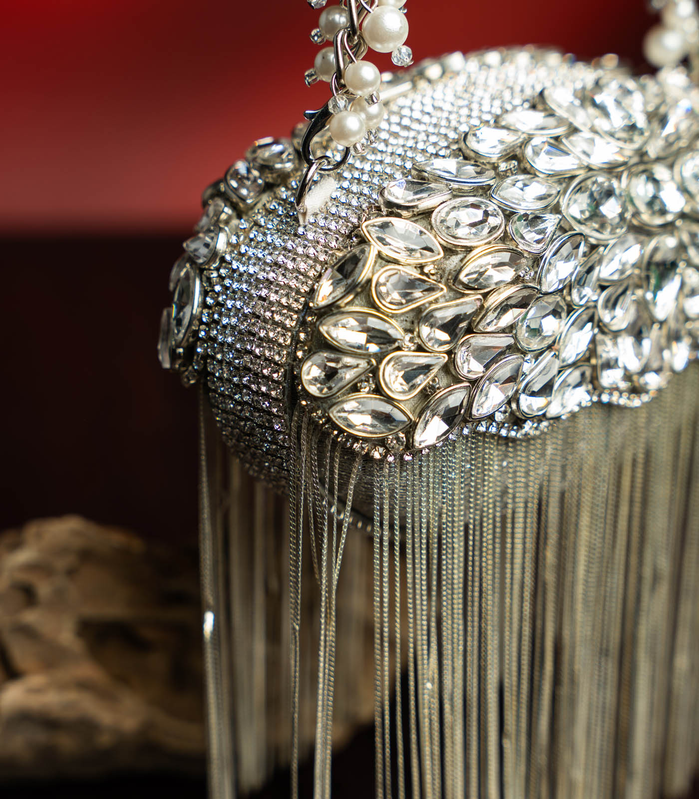A statement piece that captures the brilliance of modern glamour, the Diamond-Hinted Radiance clutch is designed to dazzle. Hand-embellished with an intricate arrangement of crystal stones that glisten like liquid light, this masterpiece evokes the allure of fine jewellery. The shimmering silver base is gracefully finished with cascading metallic fringes that sway with every movement, adding a touch of fluid elegance. Its handle, delicately entwined with pearls and silver links, brings a perfect balance of sophistication and sparkle. Ideal for evening soirées, receptions, and red-carpet moments — this clutch is where opulence meets artistry.