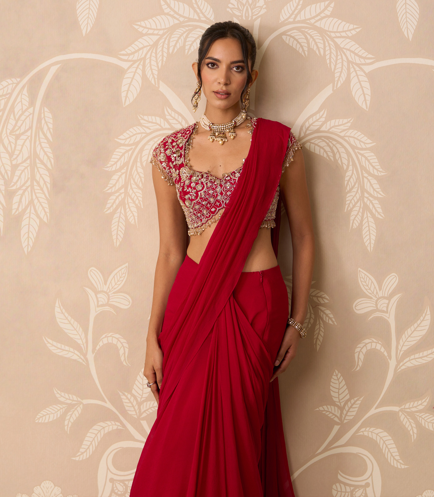 NET EMBROIDERED BLOUSE WITH CHIFFON DRAPED STITCHED SAREE