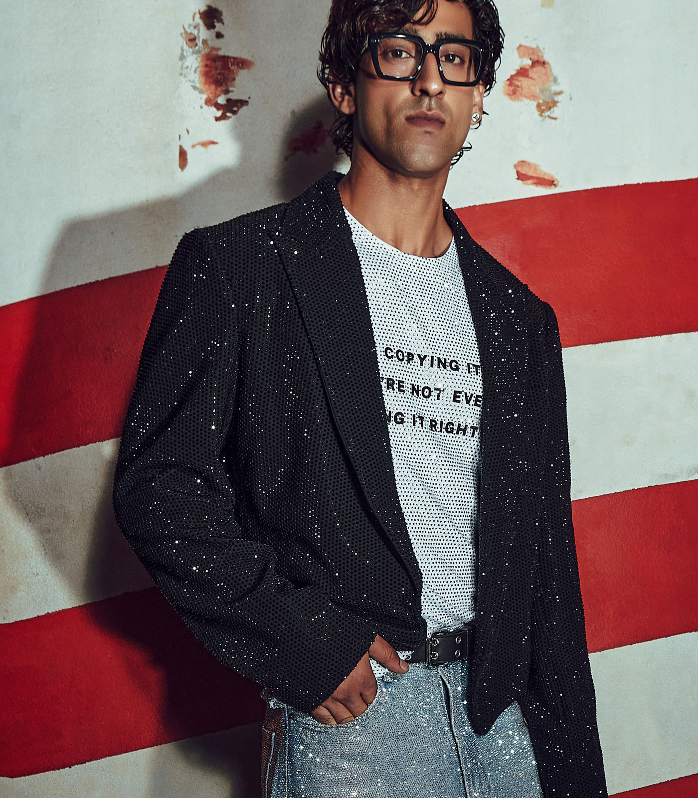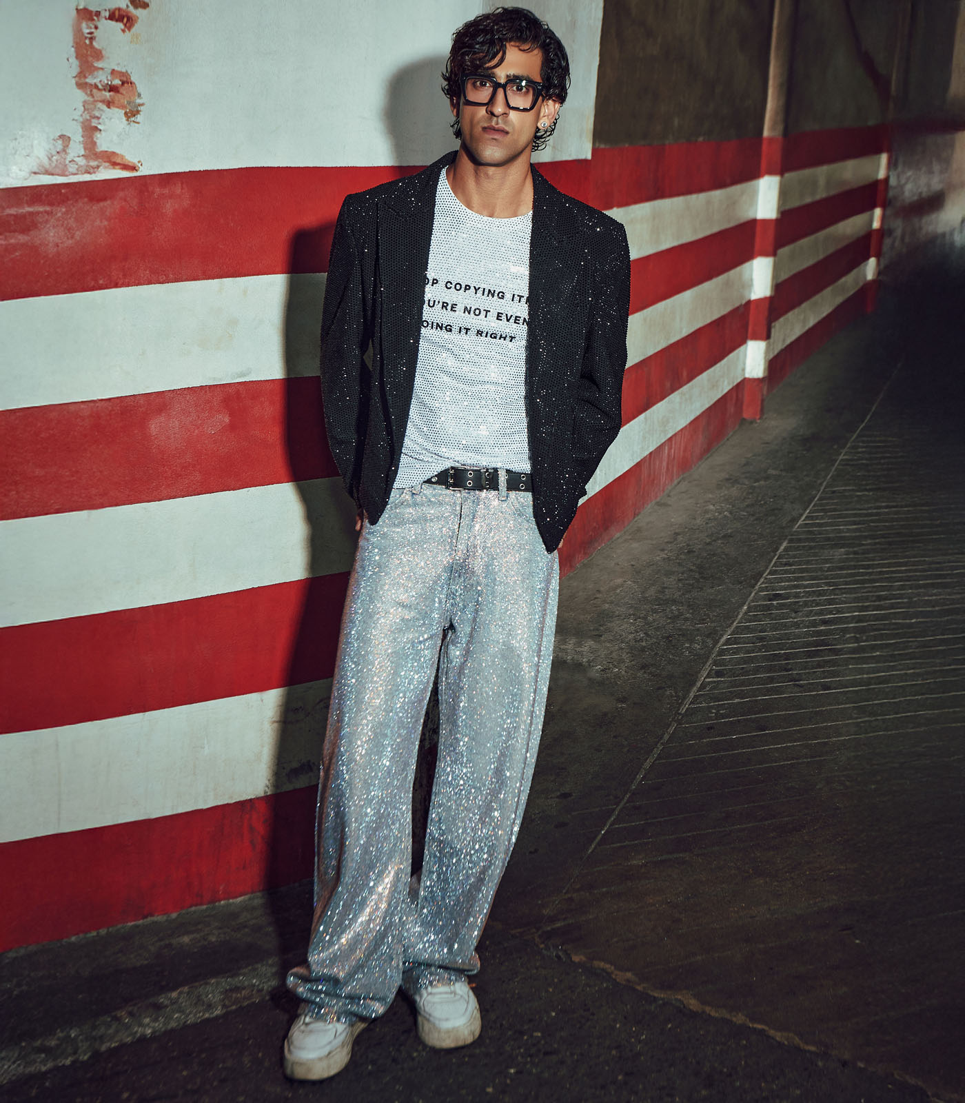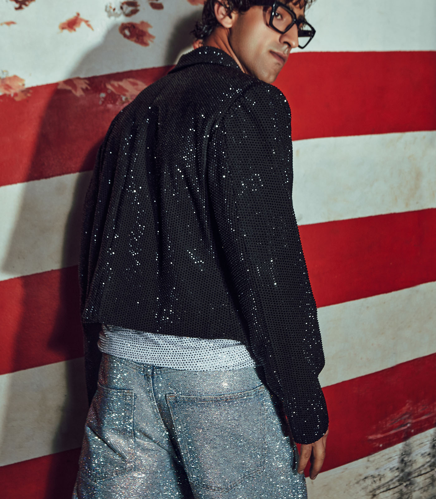 This set includes a cropped open black jacket in melon crepe, a white ribbed tank top, and silver denim jeans.