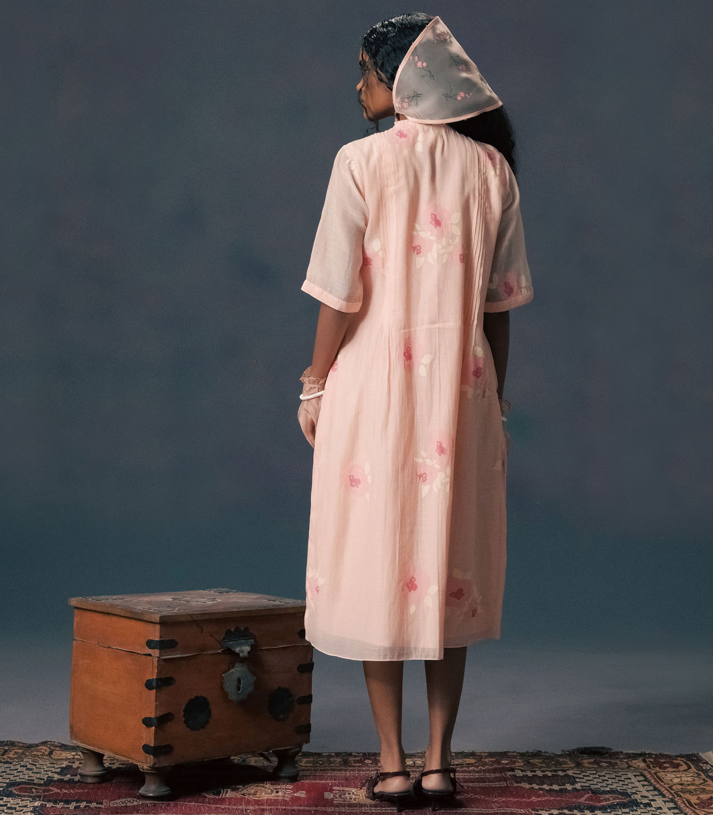 OLD ROSE FRONT PLEATED DRESS IN MUL CHANDERI WITH SCREEN PRINT