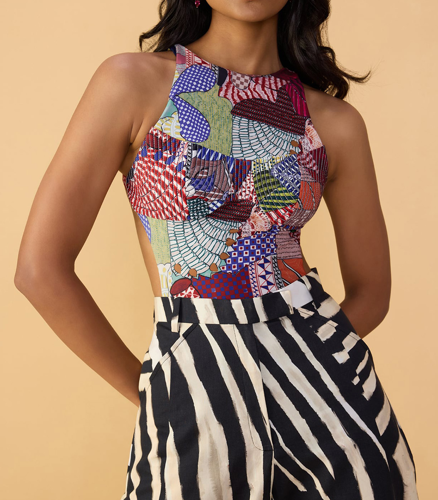 Bodysuit : Abstract bird print, high neck bodysuit with quilting and side cutout detailing