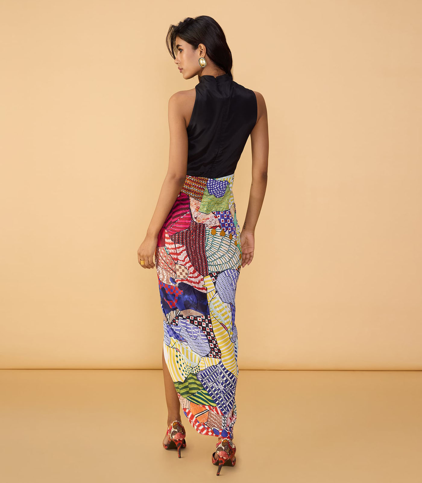 Abstract bird print halter neck drape style dress with customisable side slit