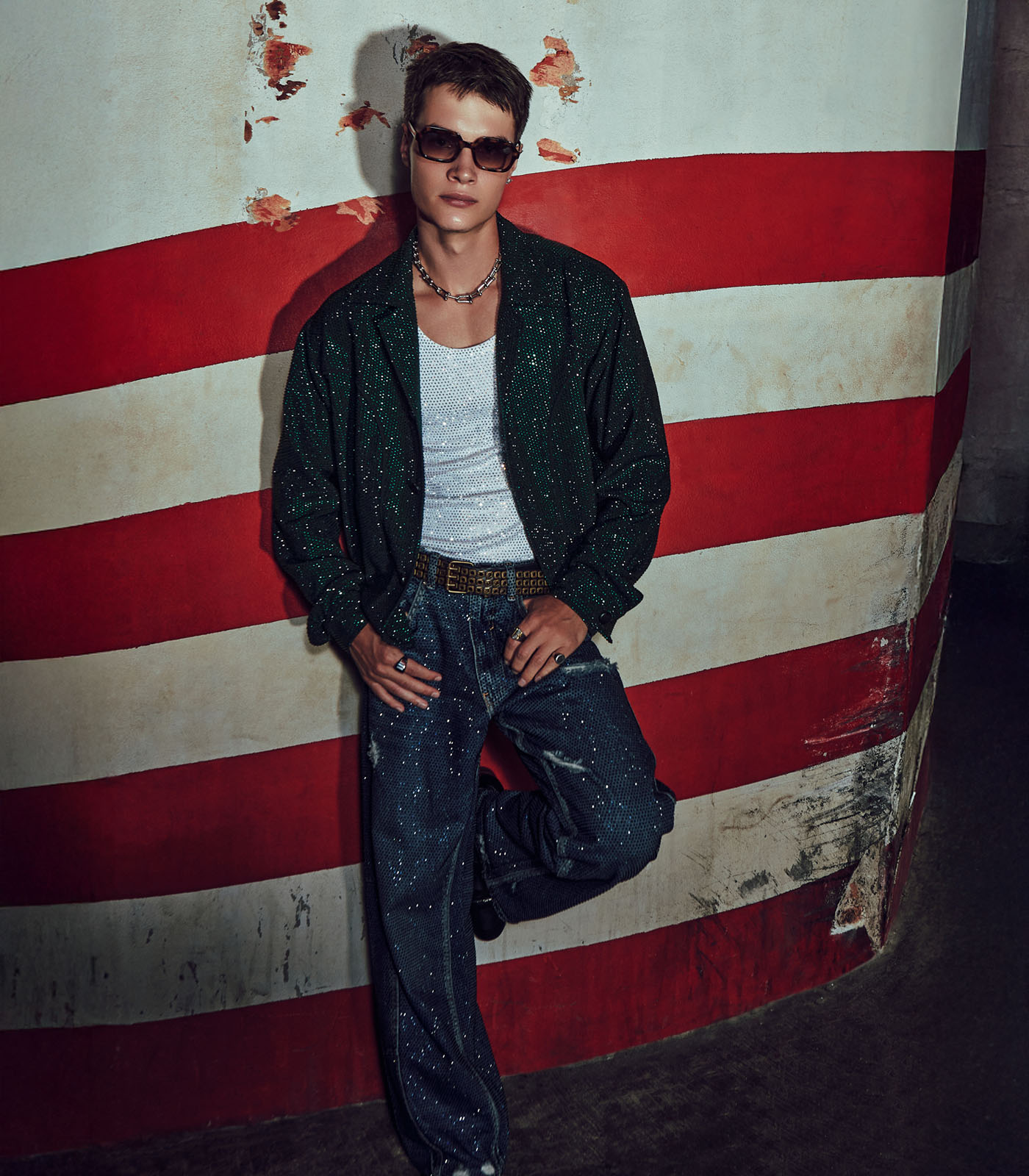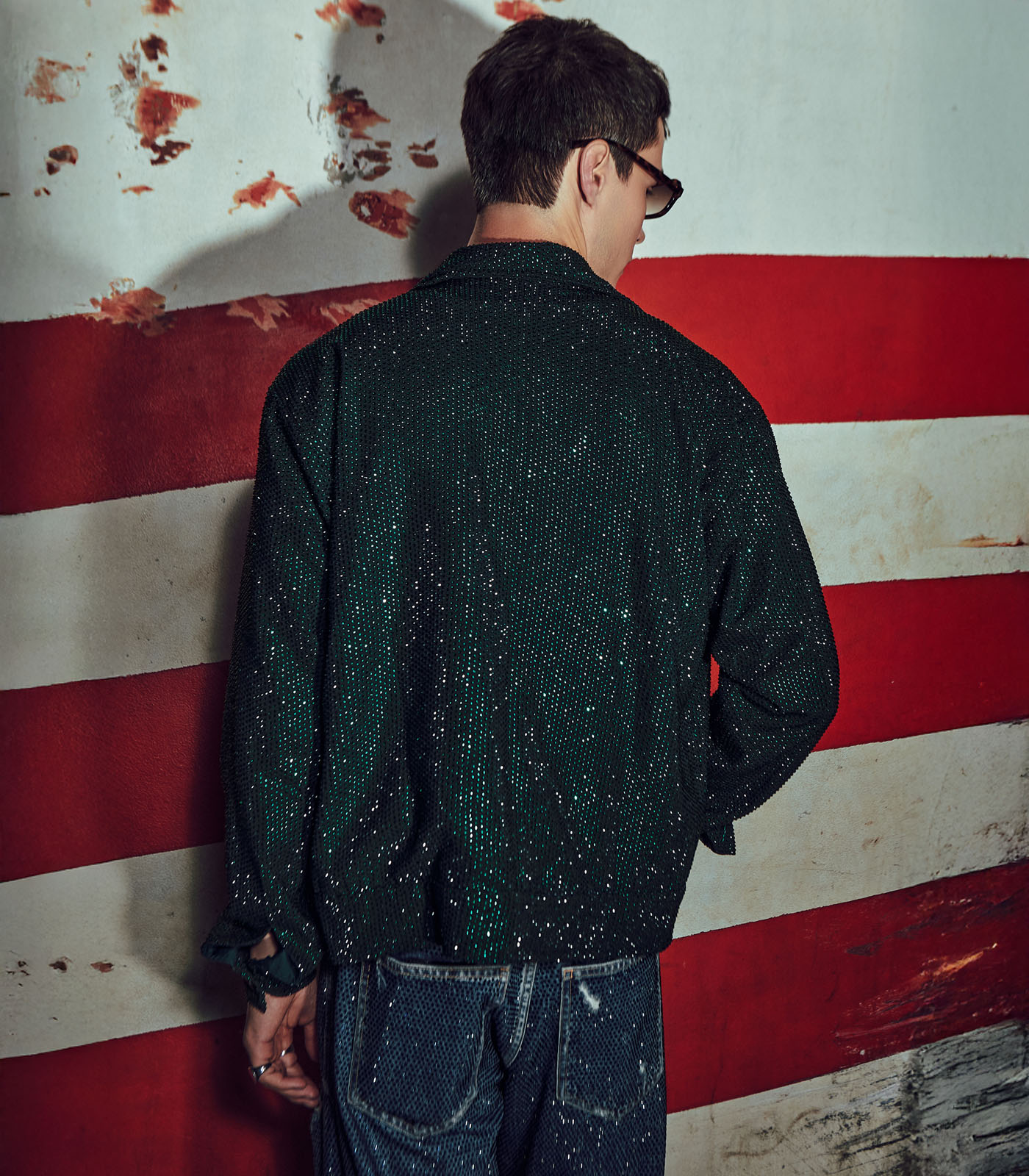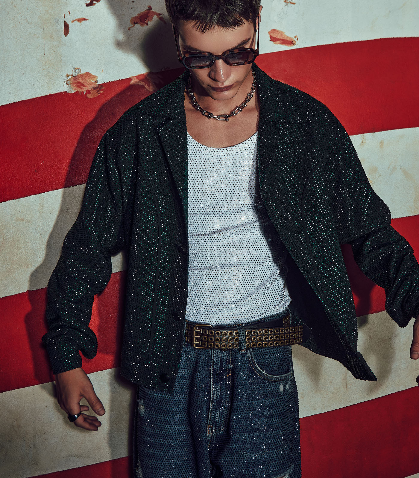 This set includes an emerald bomber jacket in melon crepe, a ribbed tank top, and denim jeans.