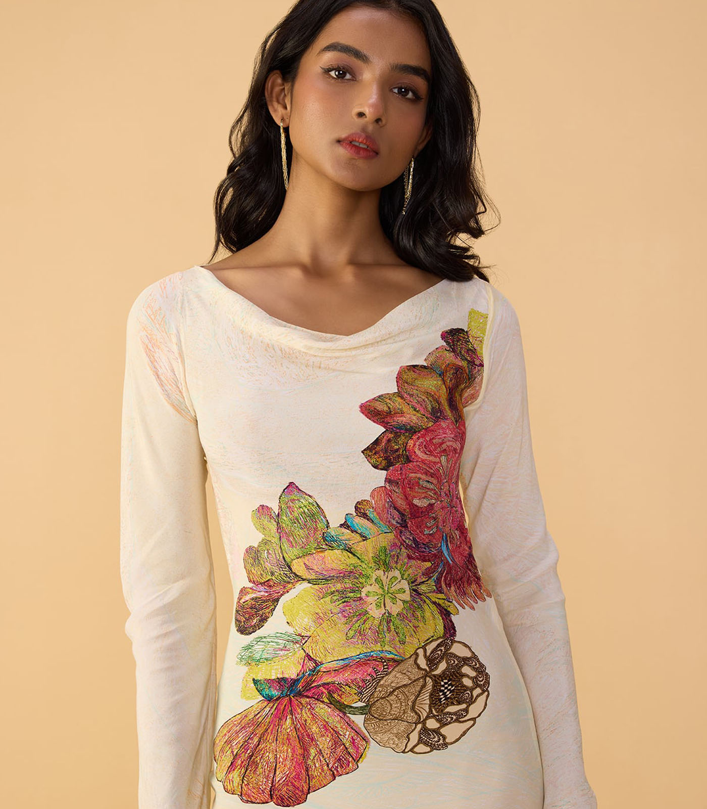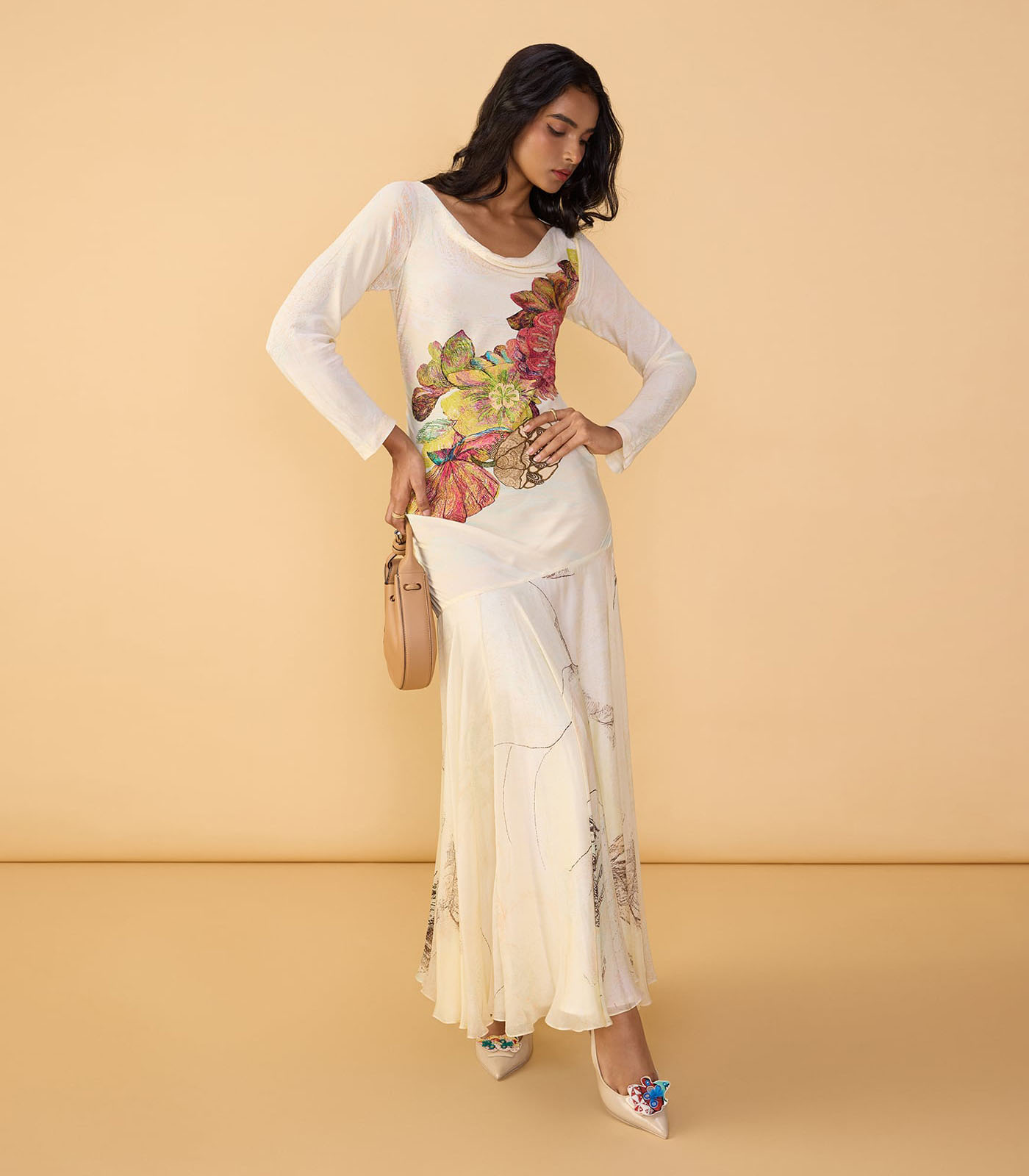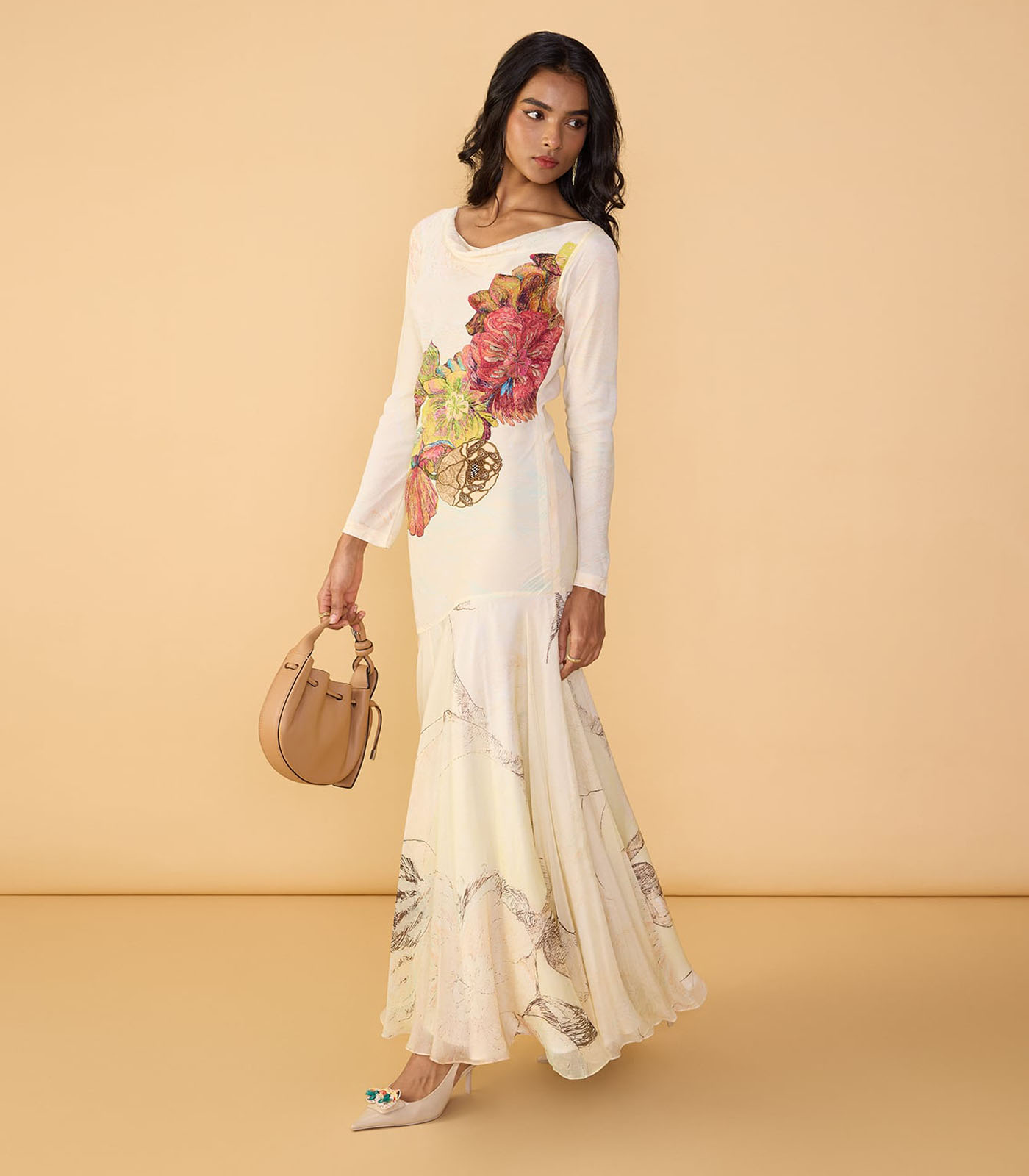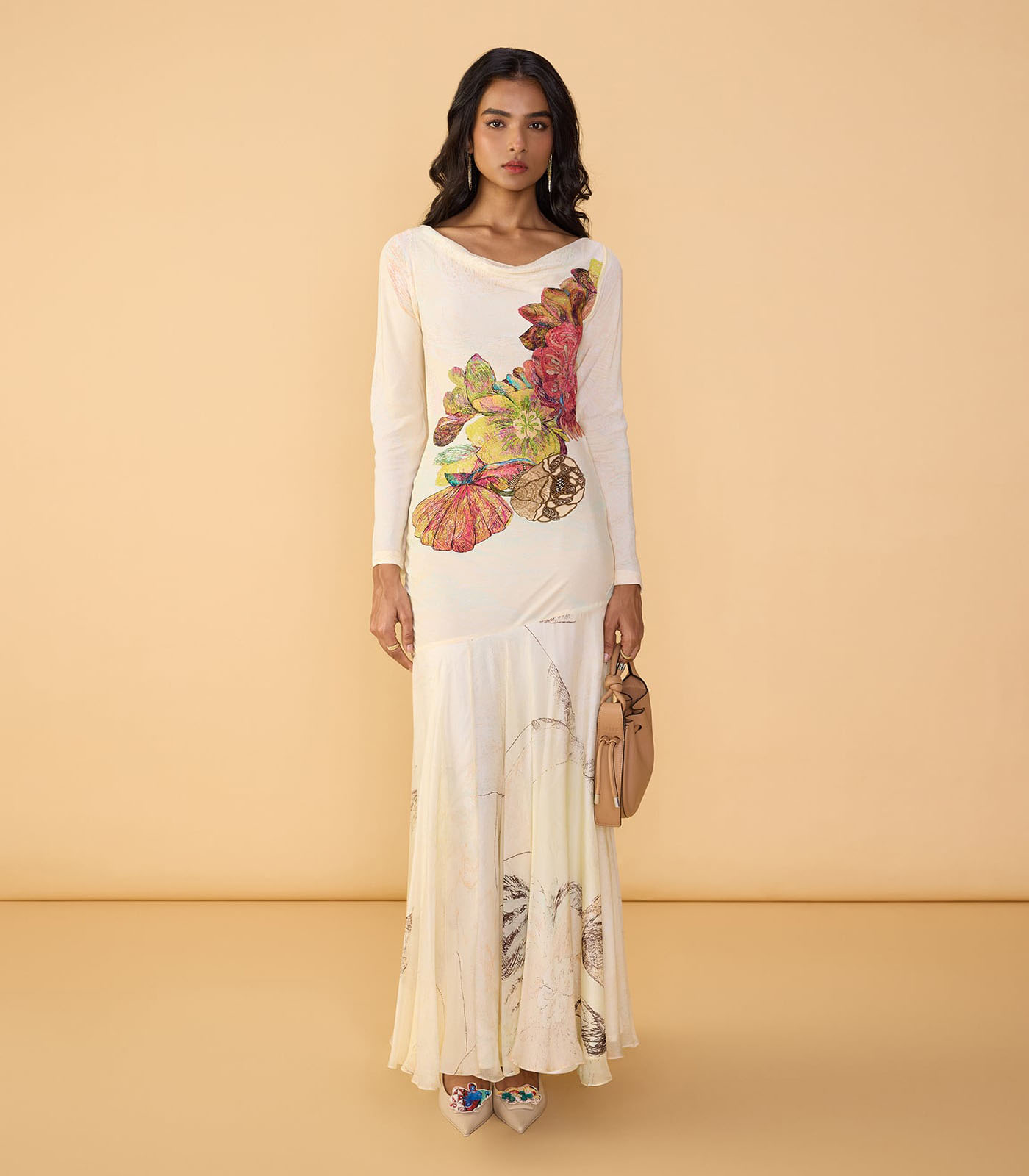 Abstract print maxi dress with long sleeves, fitted bodice and cowl neckline