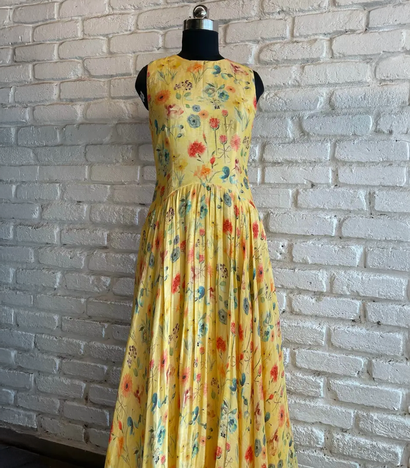 Easy breezy yellow floral maxi dress with a waist drop silhouette in a crisp linen.