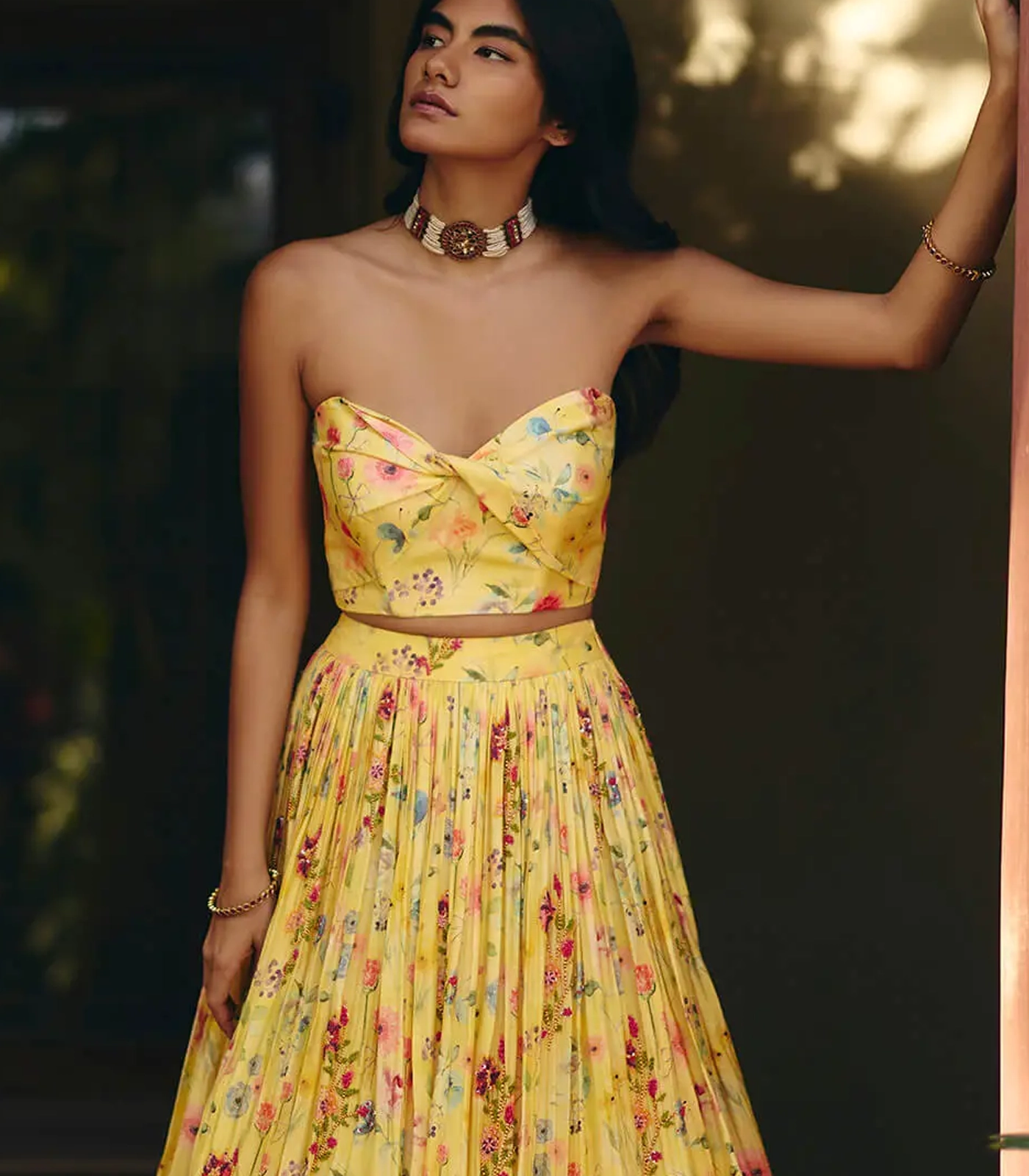 Floral corset tube top teamed with a floral lehenga highlighted with hand work.