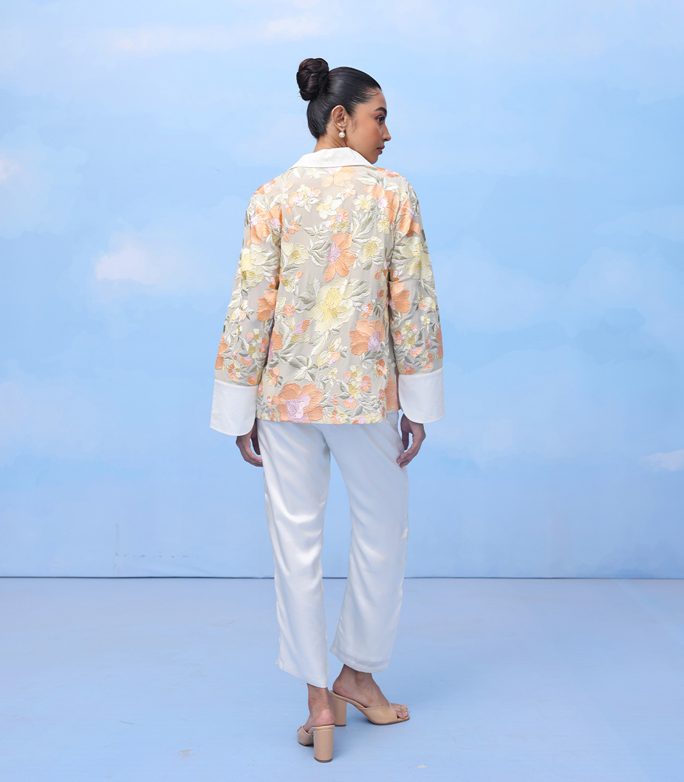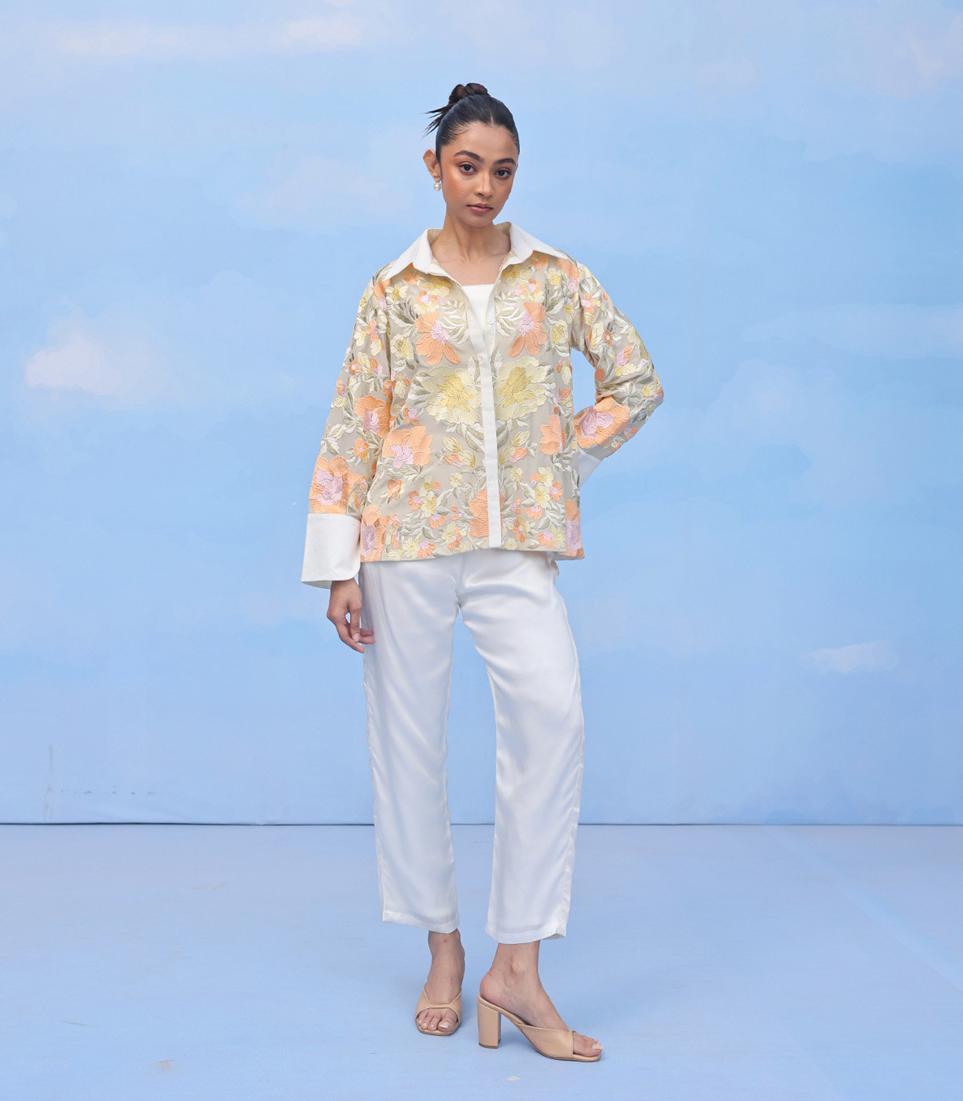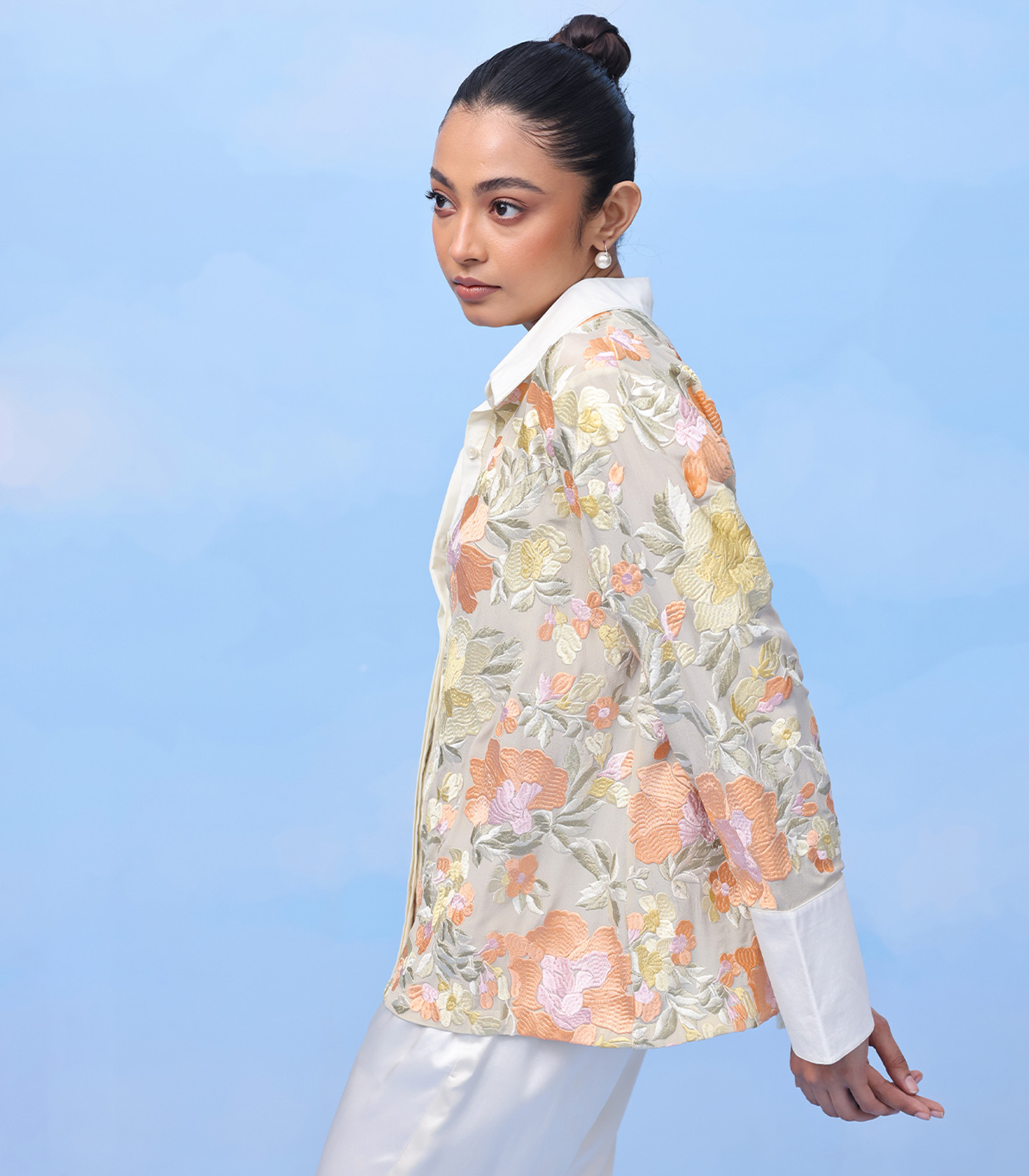 Oversized machine embroidred shirt on silk organza with set-in long sleeves and slit cuff.