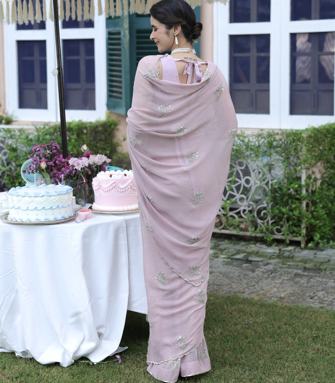 Crafted in chiffon of the finest weave, the Girl Bow Saree is adorned with cute flower bouquets bound in cutdana bows. Designed with a lightweight fall, it moves with ease and elegance, ideal for daytime celebrations and intimate gatherings. Created for women who embrace subtle grandeur and refined taste.
