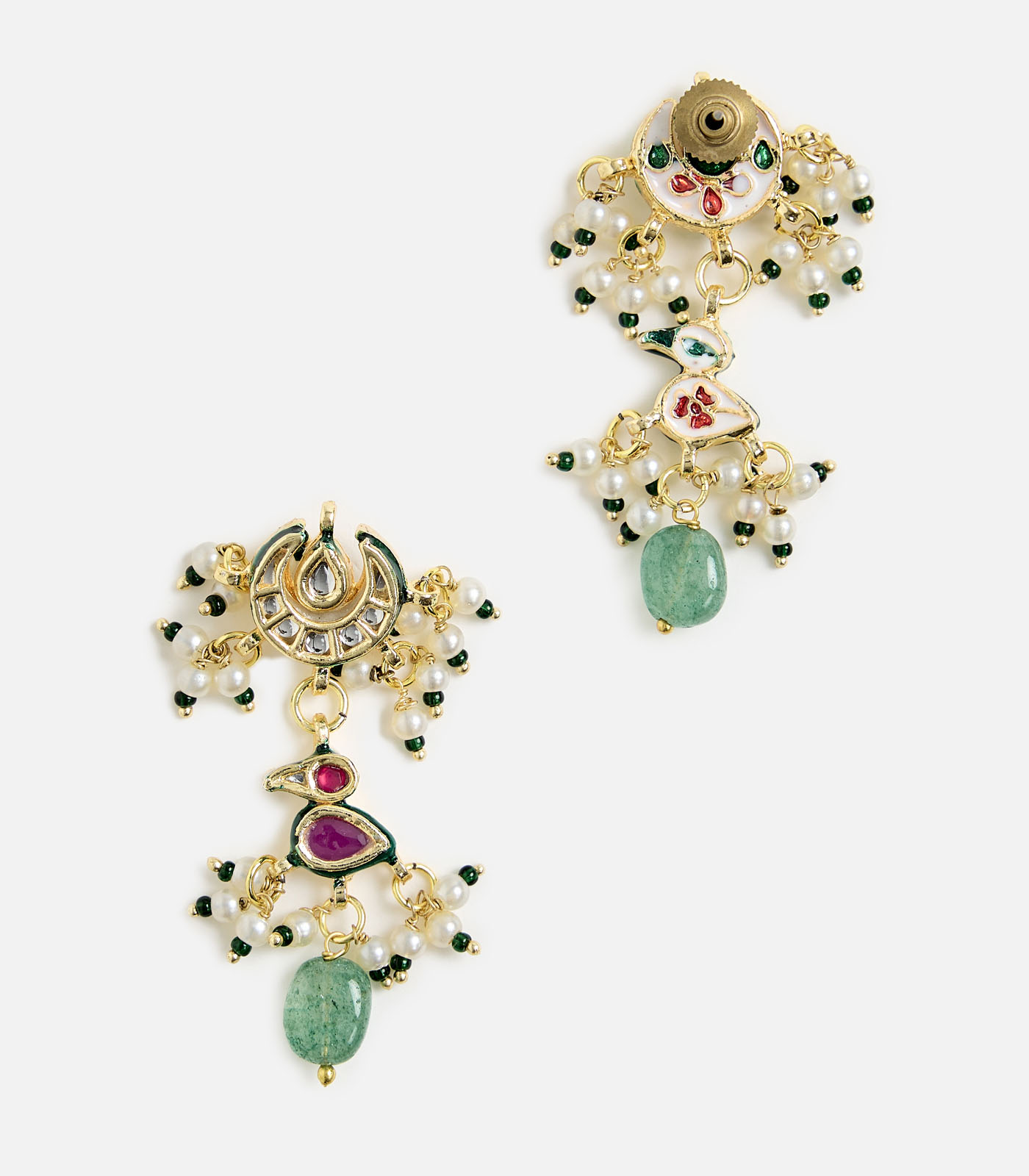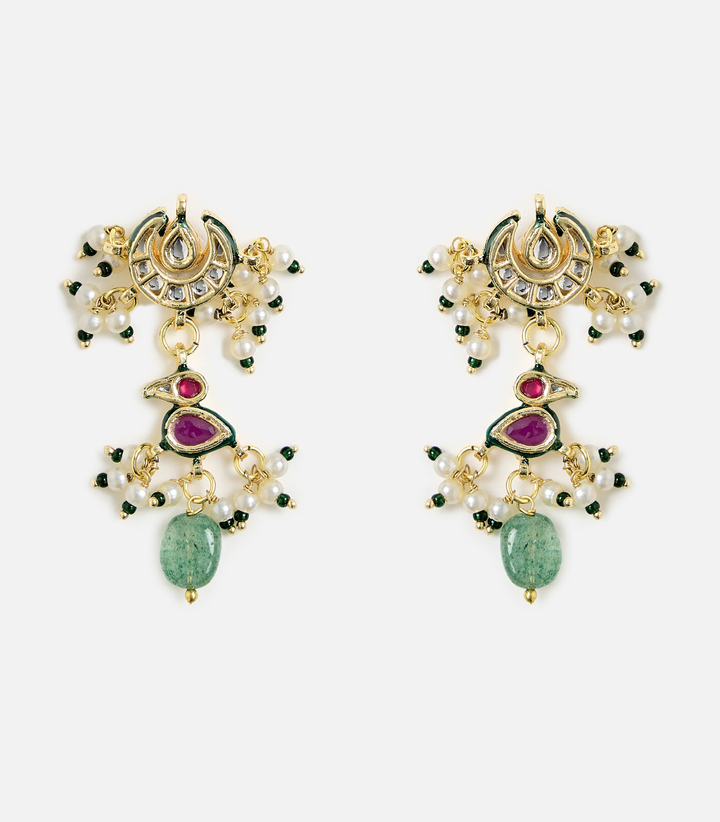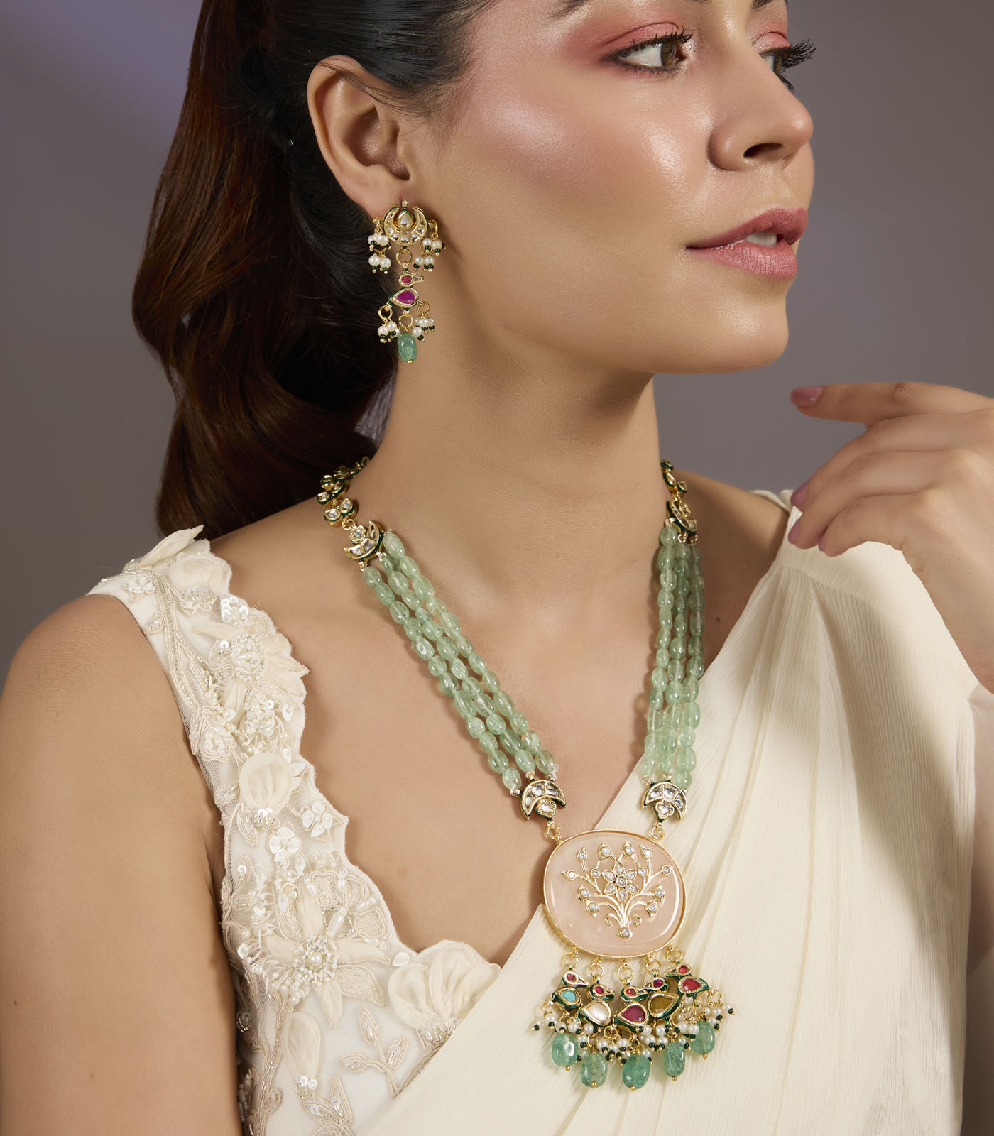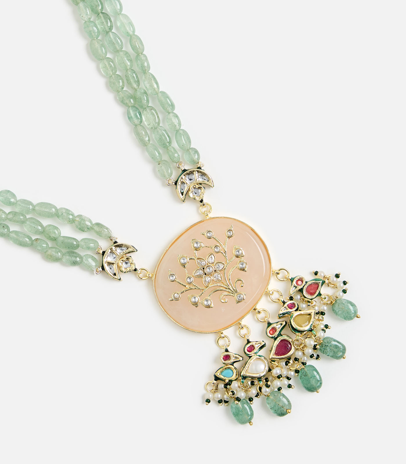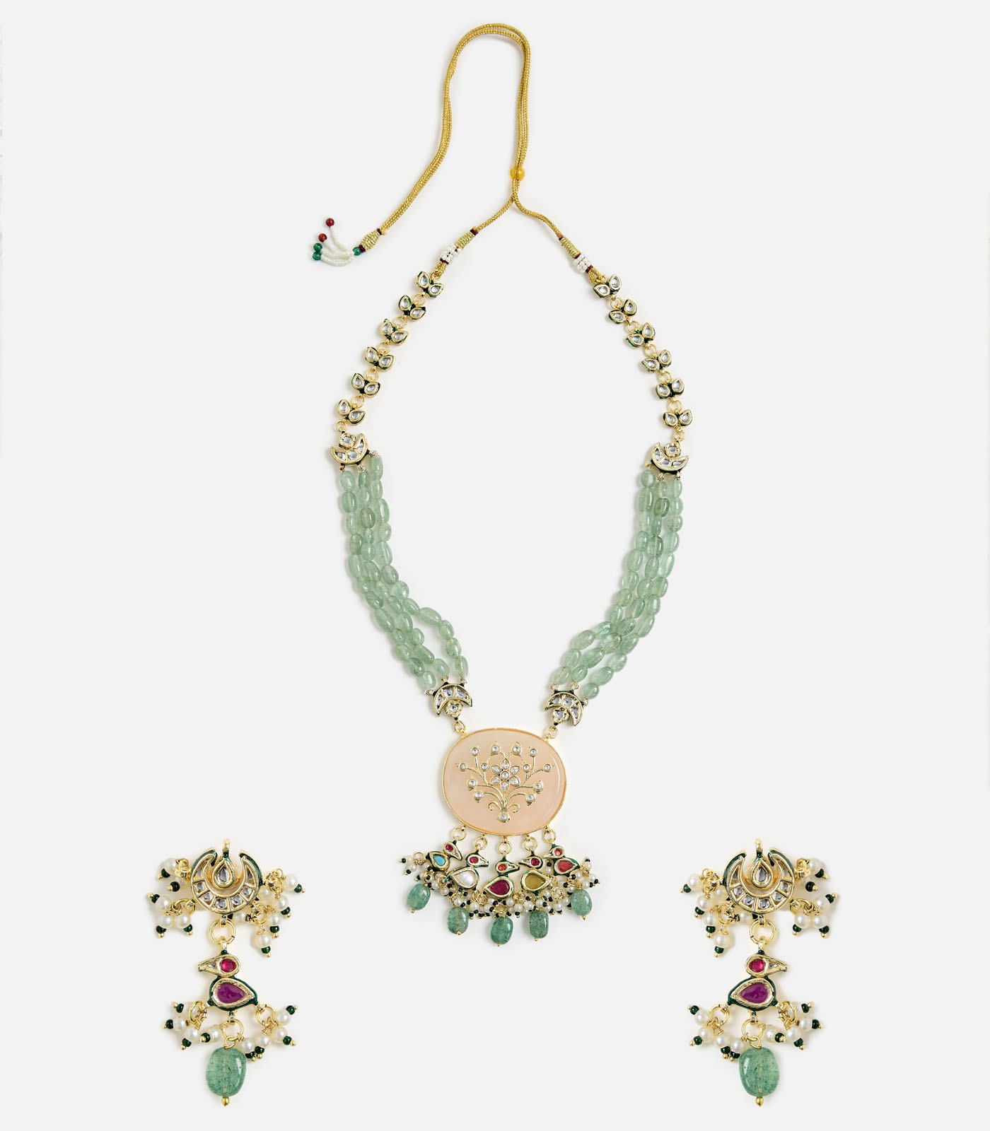 A statement green beaded kundan choker set with floral motifs and dangling drops, paired with matching earrings. Perfect for weddings, festive occasions, and elegant soirées.