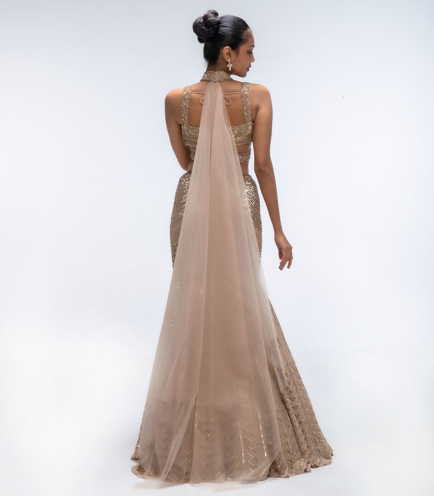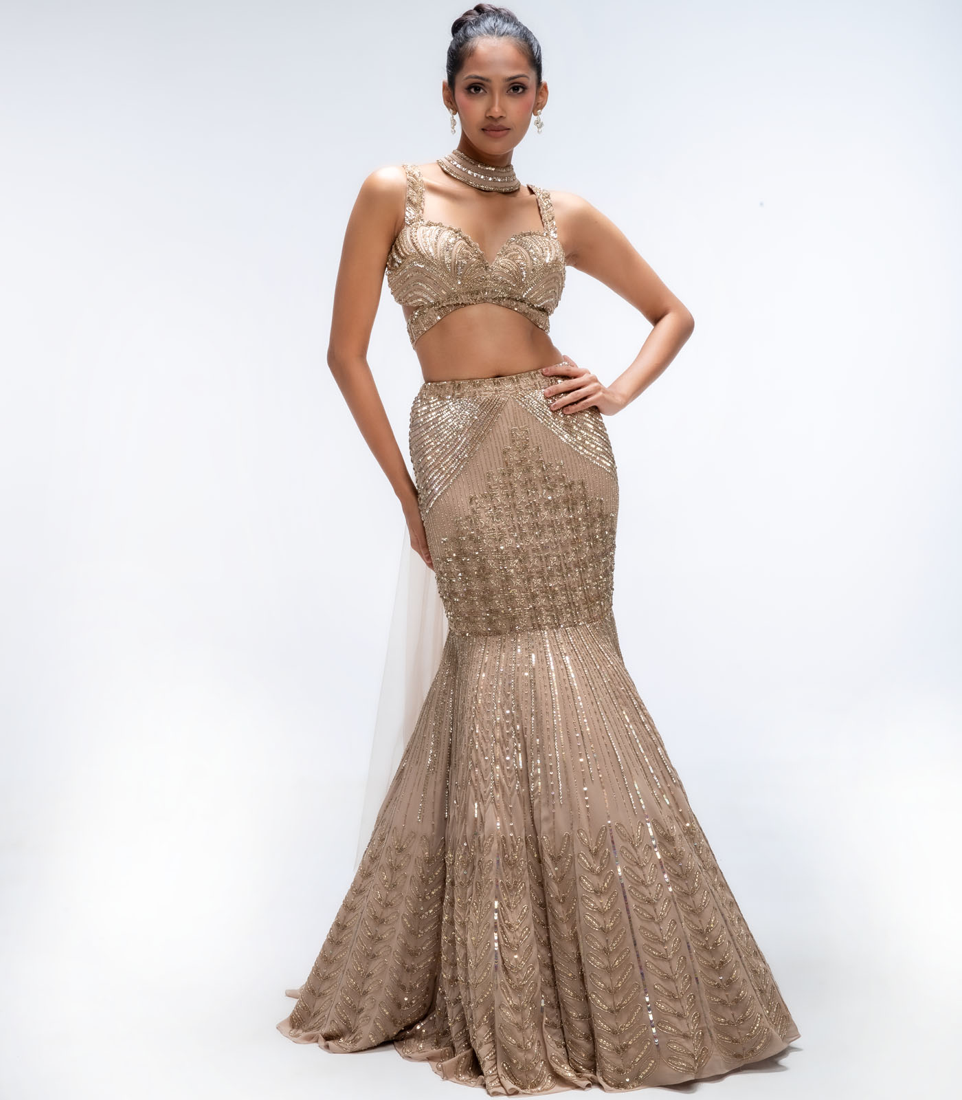 Gold Mirage Pure Silk Organza Embellished Fish-Cut Lehenga Set