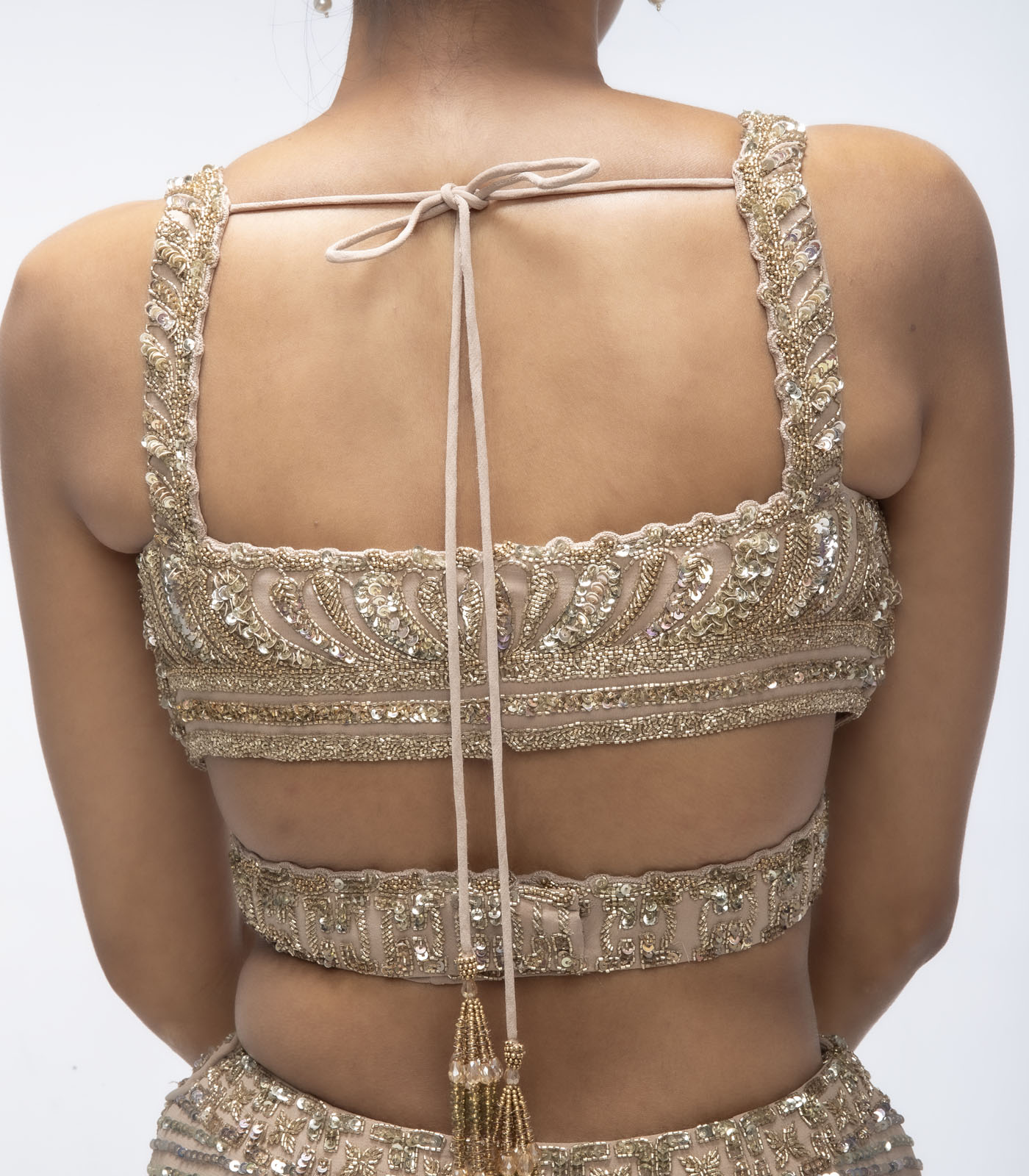 Featuring a gold mirage fish-cut lehenga in pure silk organza and pure georgette base with cutdana, sequins, french-cut and moti embellishments. It is paired with an embellished blouse and a dupatta. Accentuate it with polki jewellery, a polti bag and block heels for a wedding or engagement ceremonies.