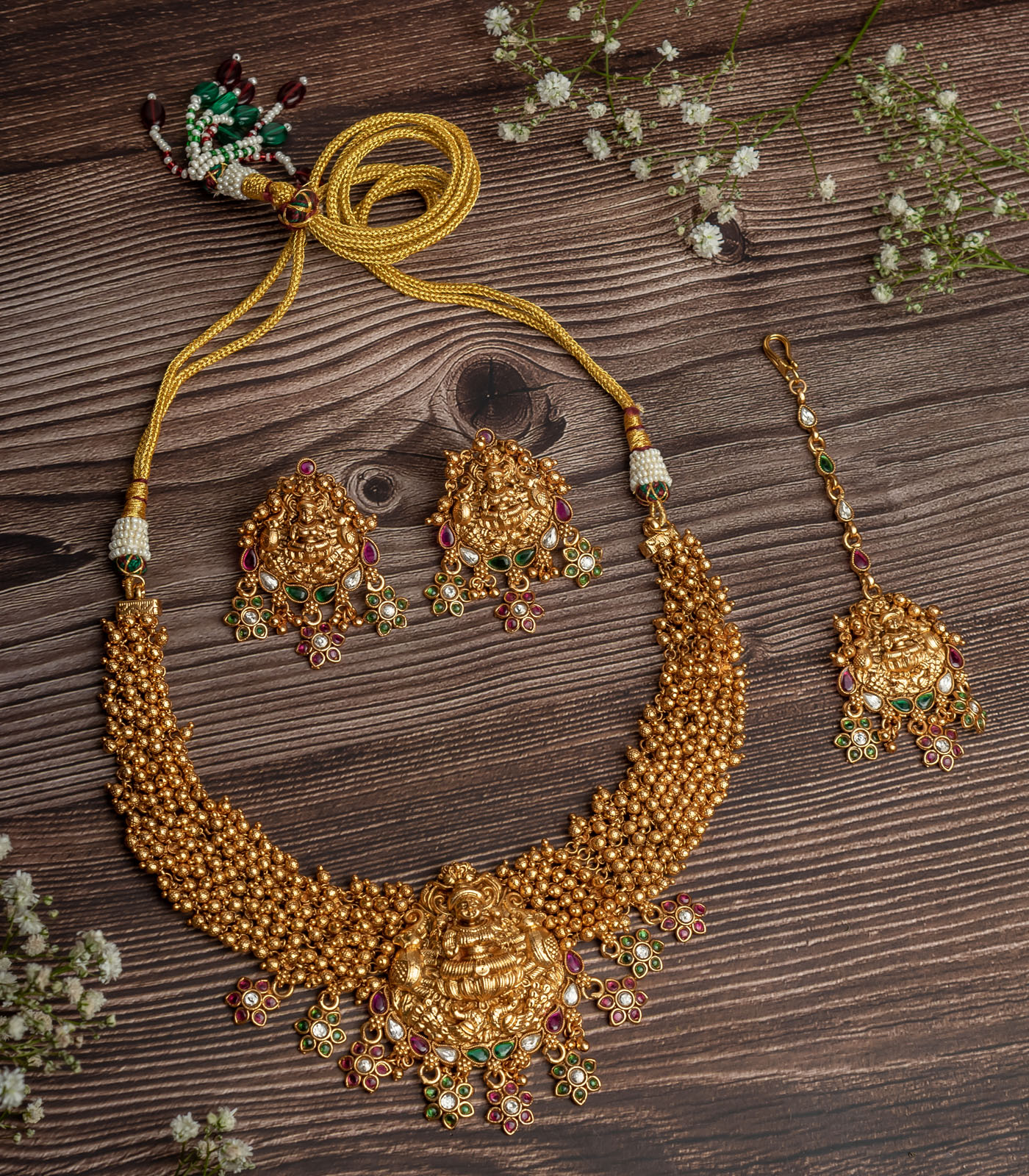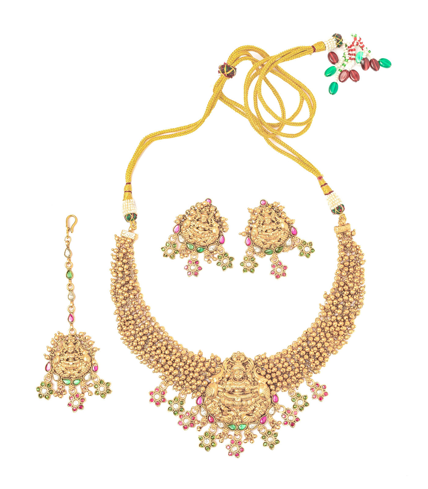 A traditional gold-tone choker necklace with intricate beaded detailing, adorned with colorful gemstones. Paired with matching jhumka earrings and a maang tikka, it’s perfect for festive and bridal occasions.