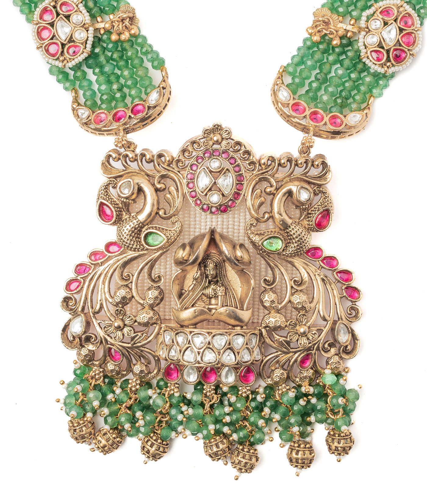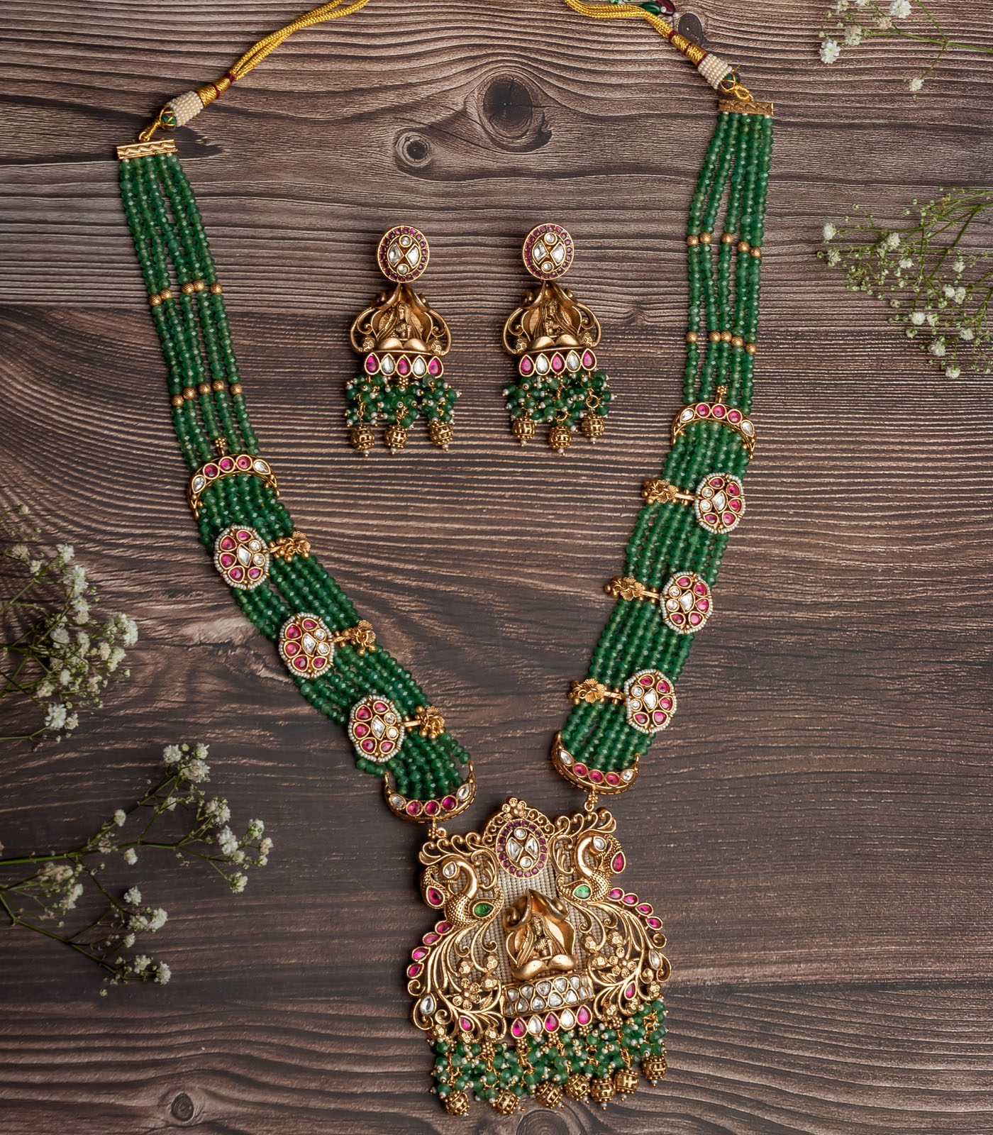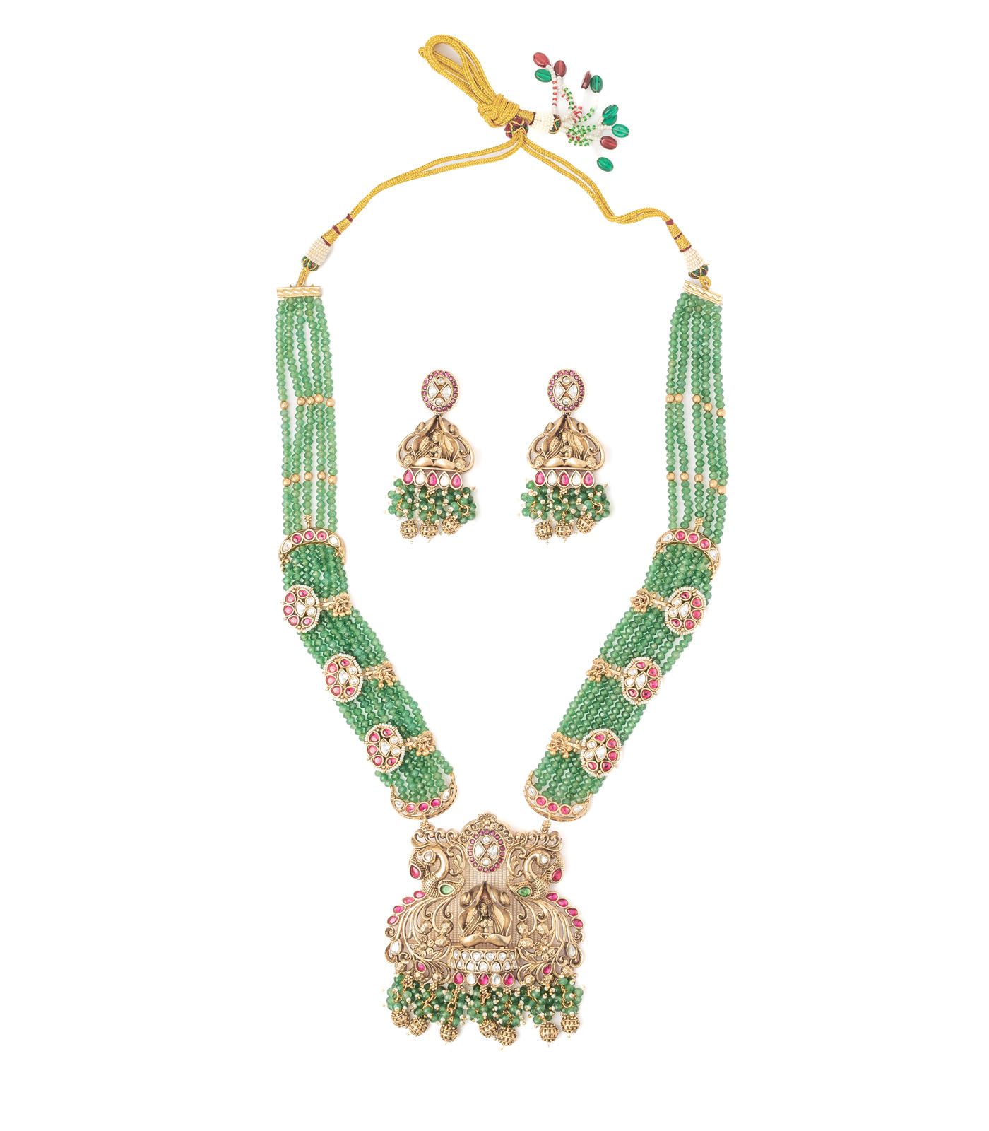A traditional necklace set with layered green beads, floral gold accents, and a divine pendant, paired with matching earrings. Perfect for weddings and festive occasions, exuding cultural elegance and grace.