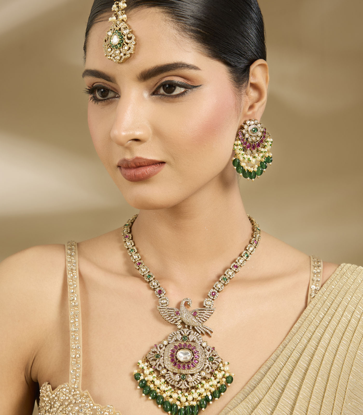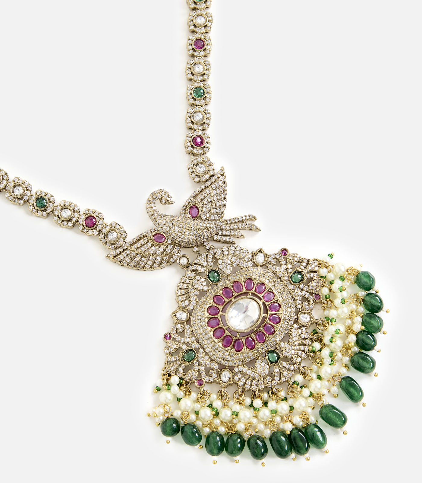 Traditional gold-plated long necklace set adorned with green and white stones, featuring matching earrings and maang tikka, perfect for weddings, parties, and festive celebrations.
