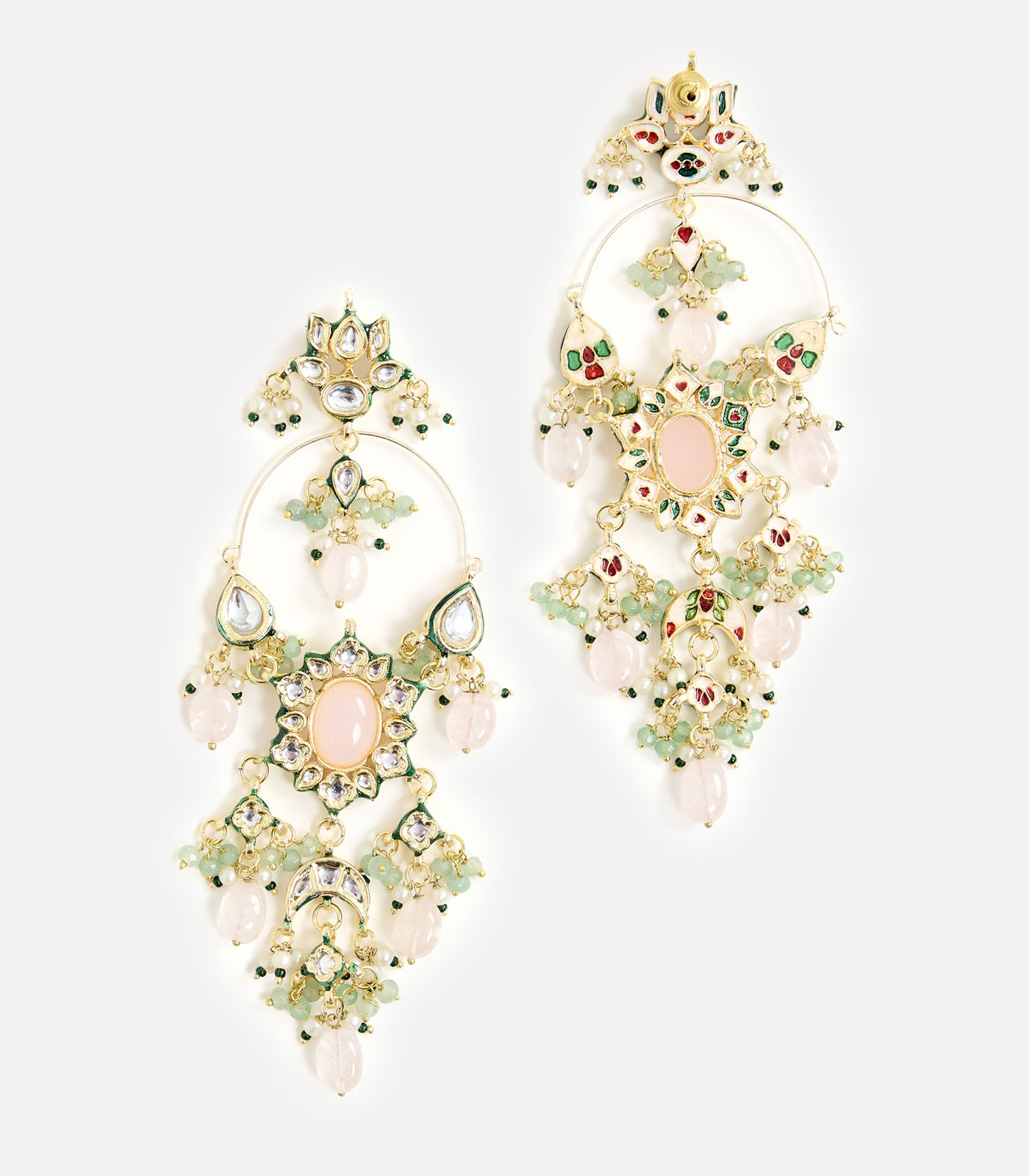 Make a bold statement with these exquisite chandelier earrings, adorned with pastel pink stones and green accents. Perfect to pair with sarees or lehengas for weddings and festive occasions.