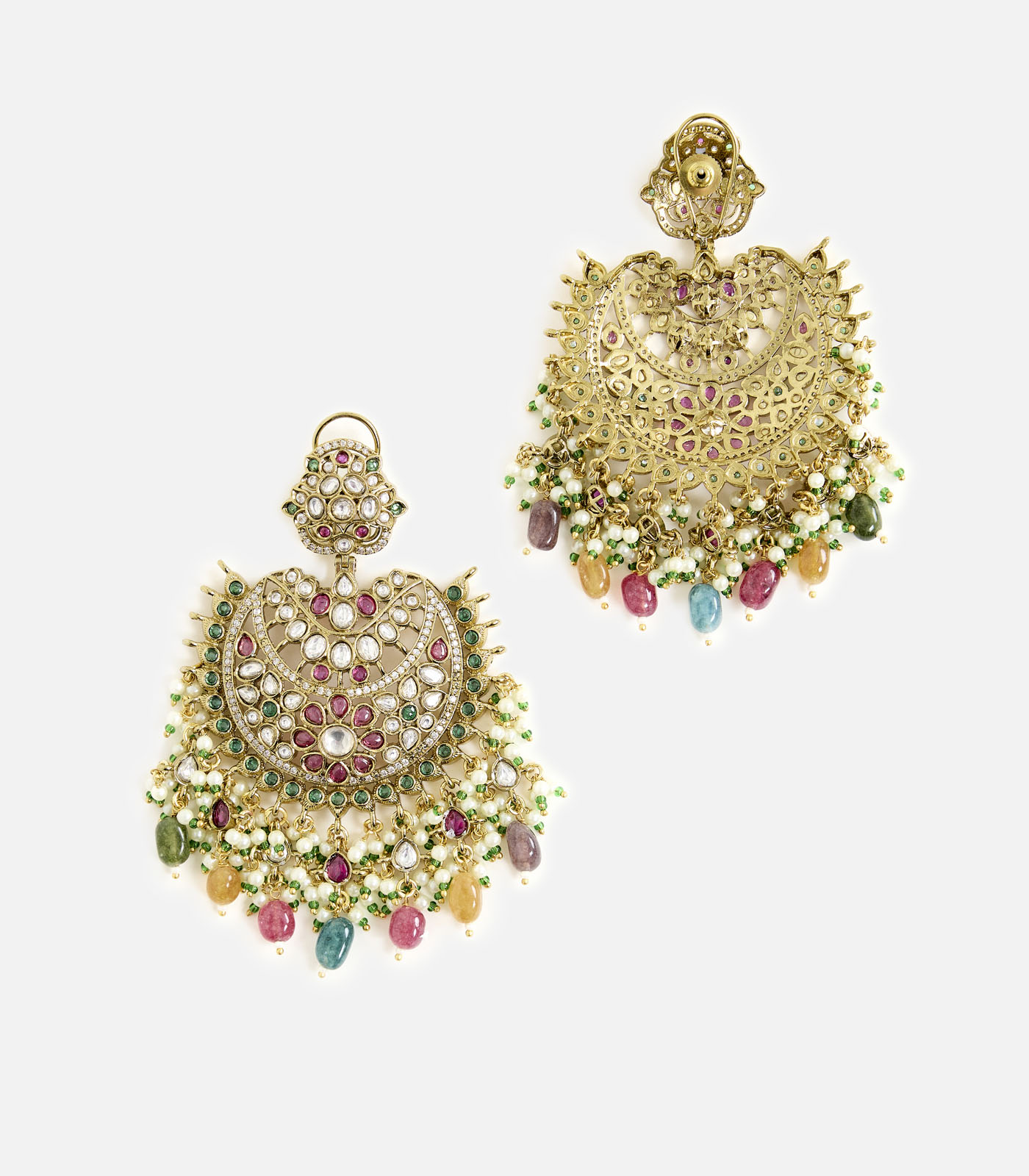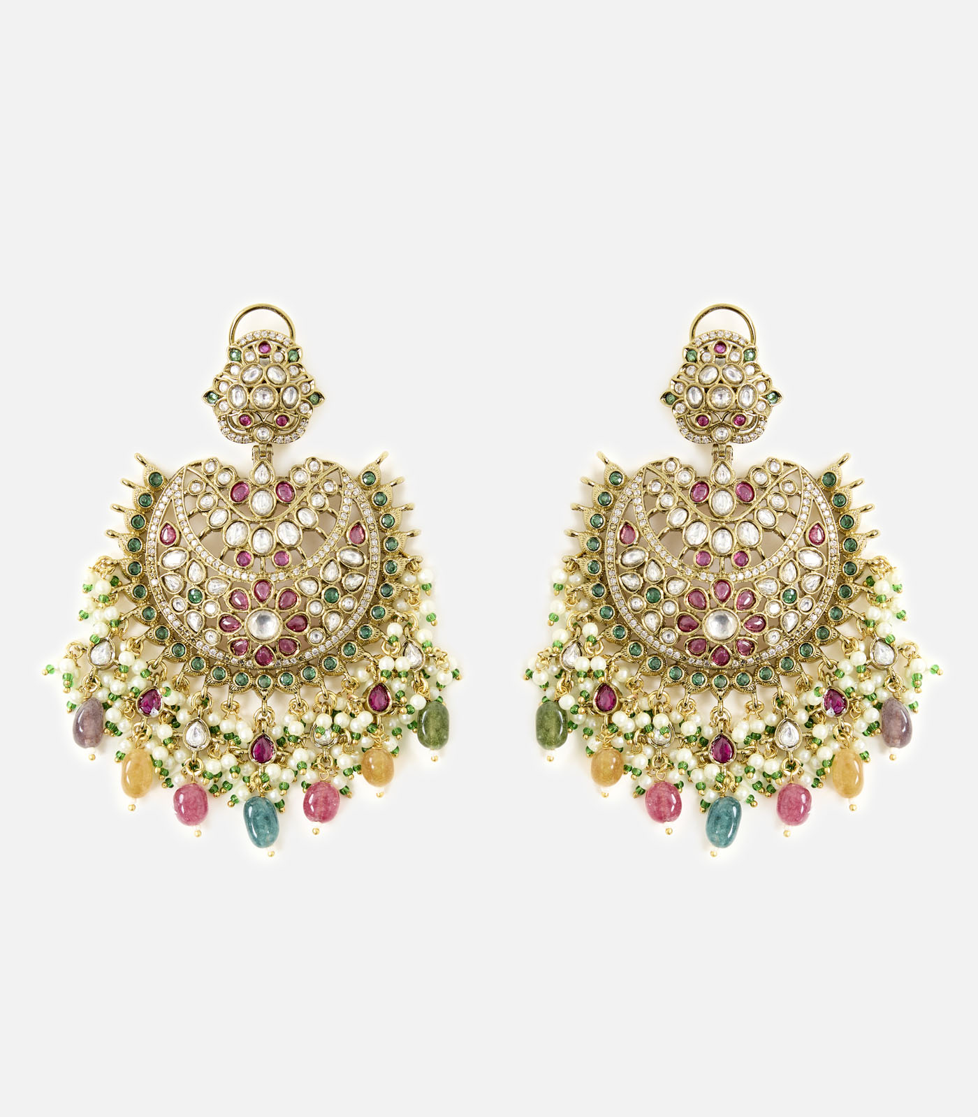 Elegant gold-plated chandelier earrings adorned with multicolor stones and intricate detailing, perfect for weddings, festive occasions, and statement evening looks.