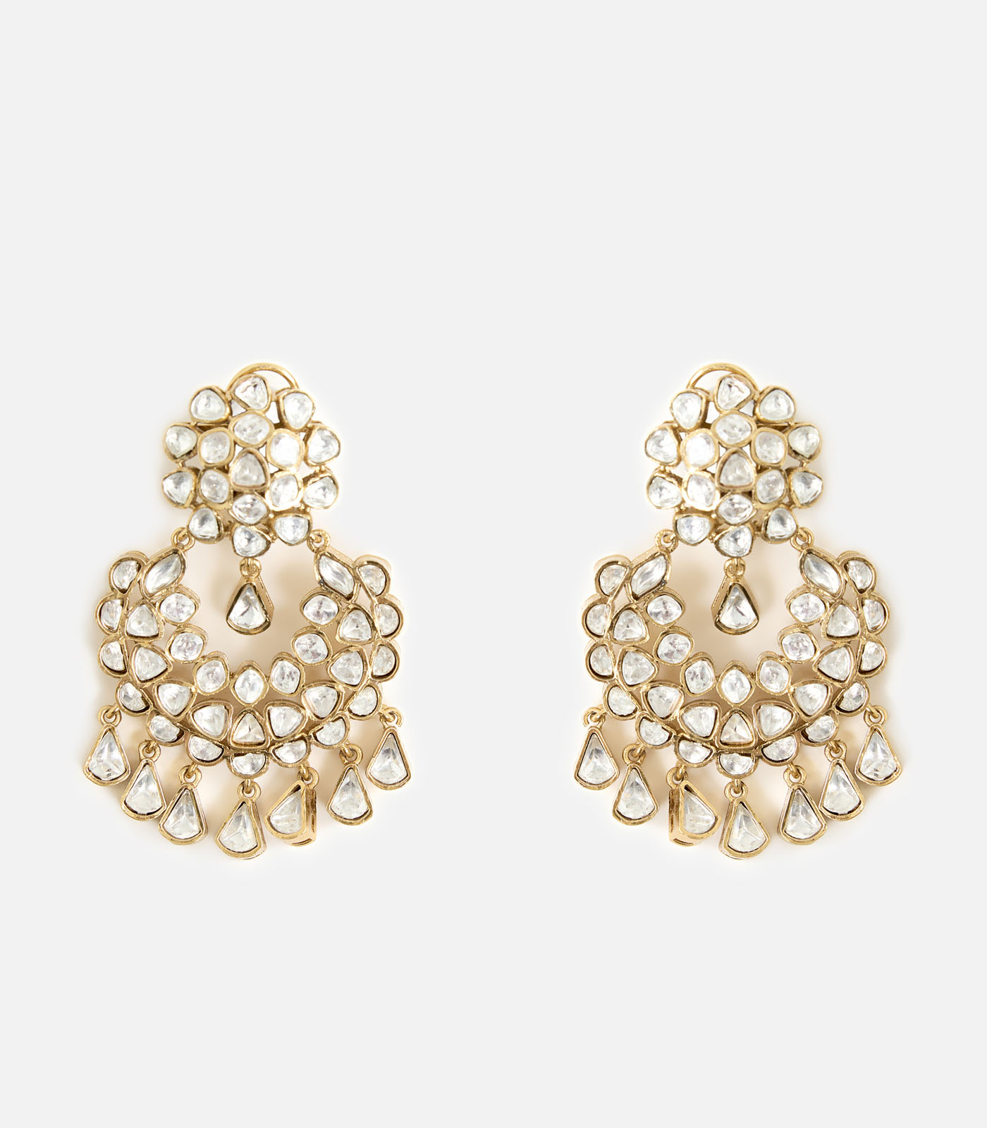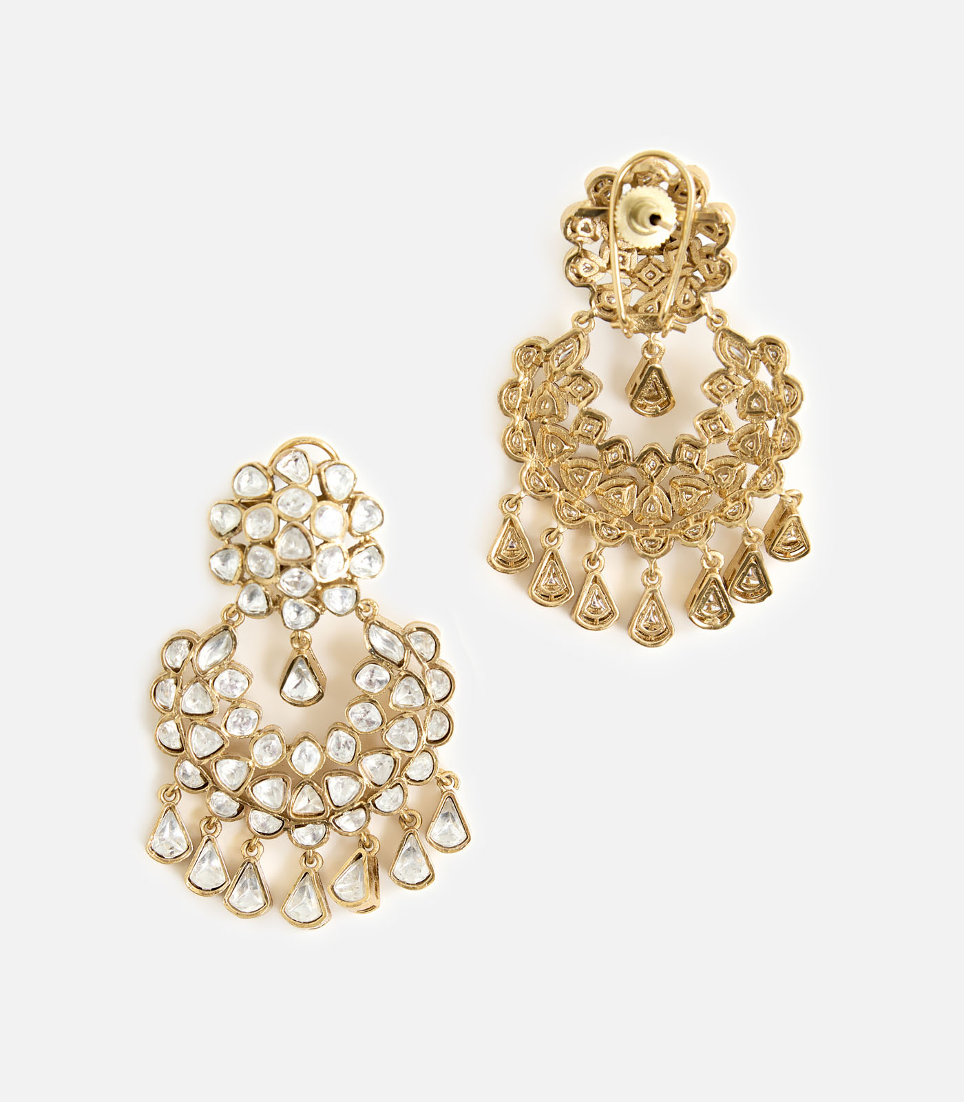 Gold-plated chandelier earrings adorned with pearls and stones, offering a lightweight yet statement look. Perfect to style with ethnic, festive, or party outfits for timeless elegance.