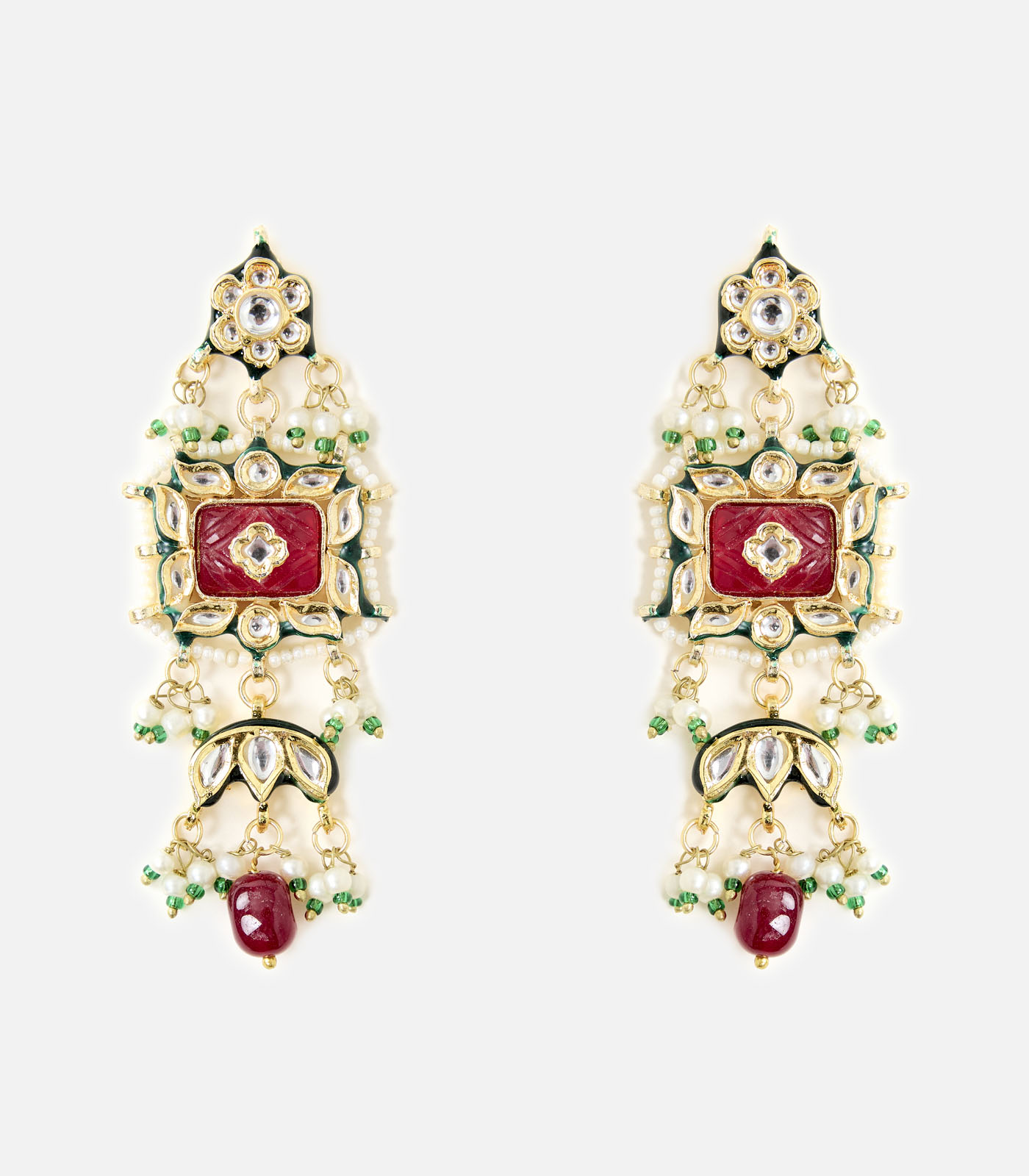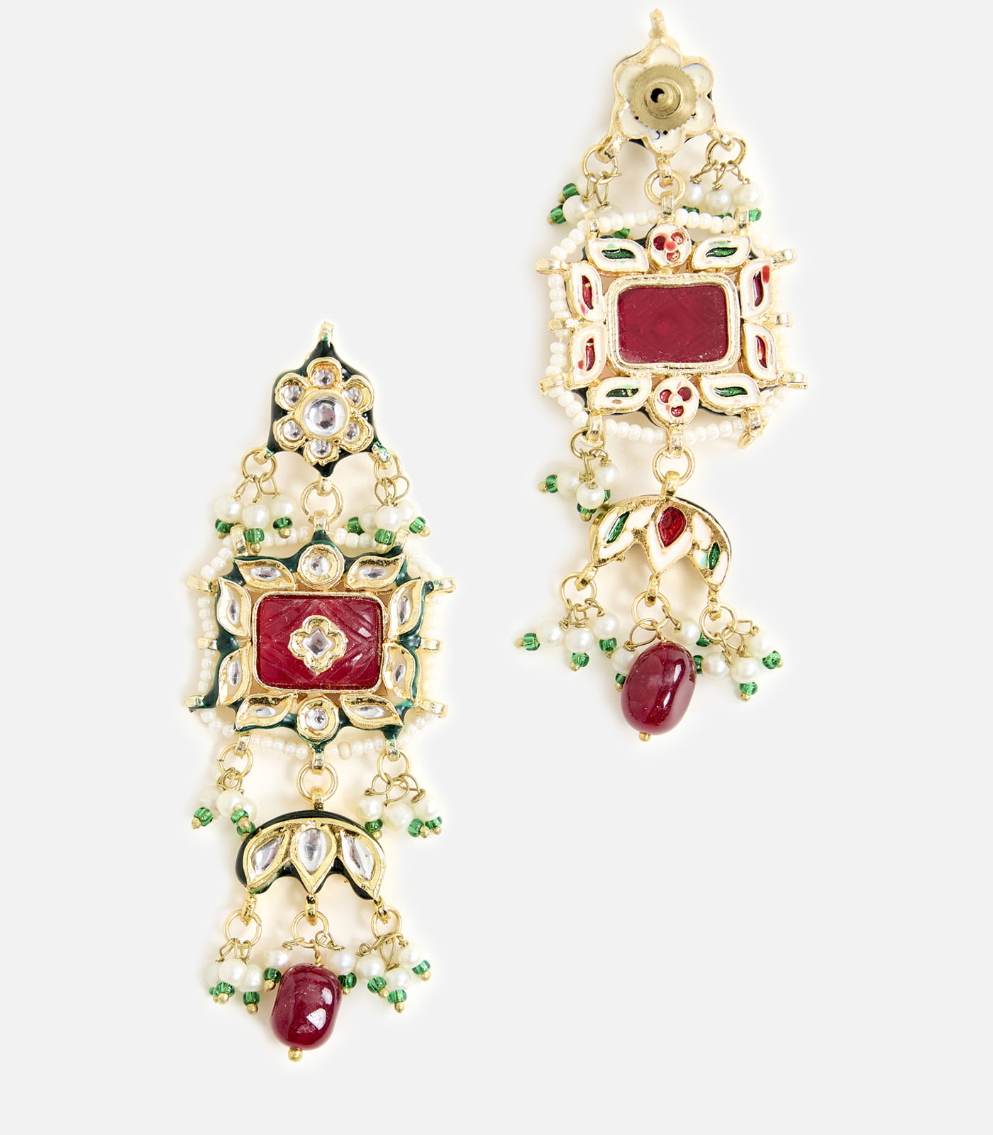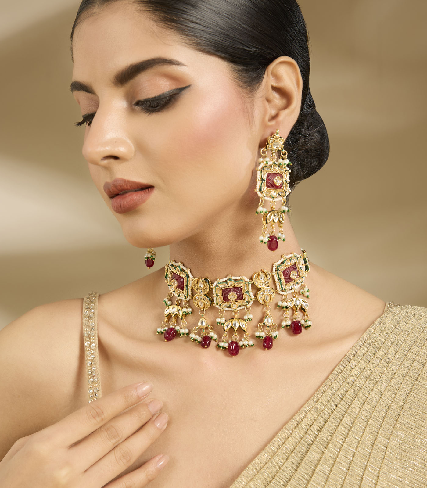 Exquisite gold-tone choker set with matching earrings, adorned with red stones and pearl accents. Perfect for weddings, festive celebrations, and special occasions, adding regal charm to any attire.