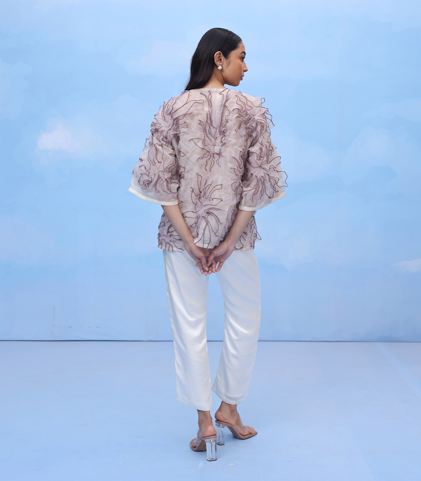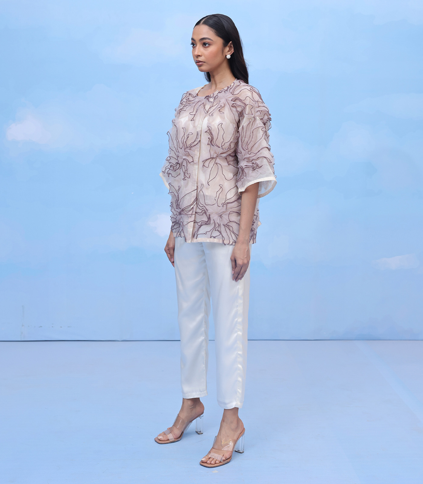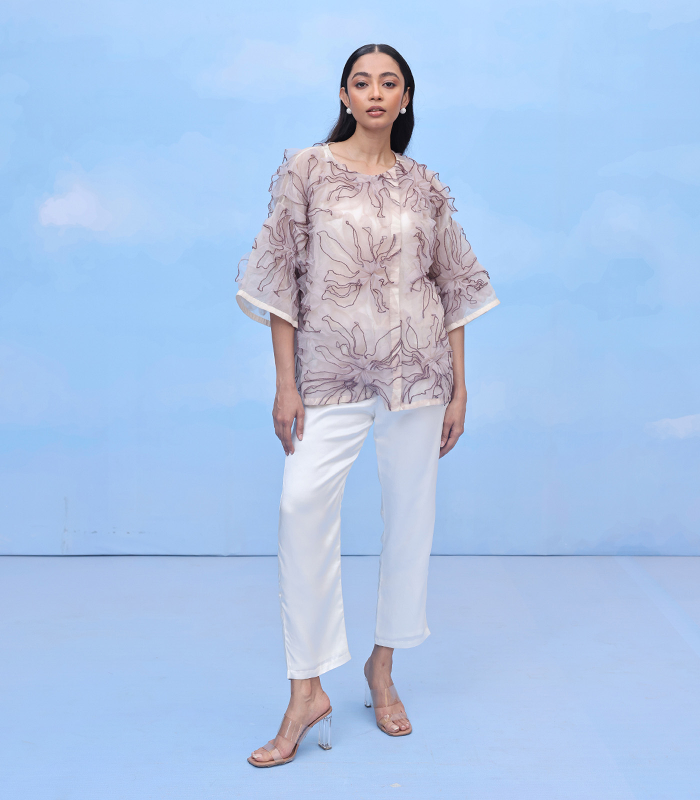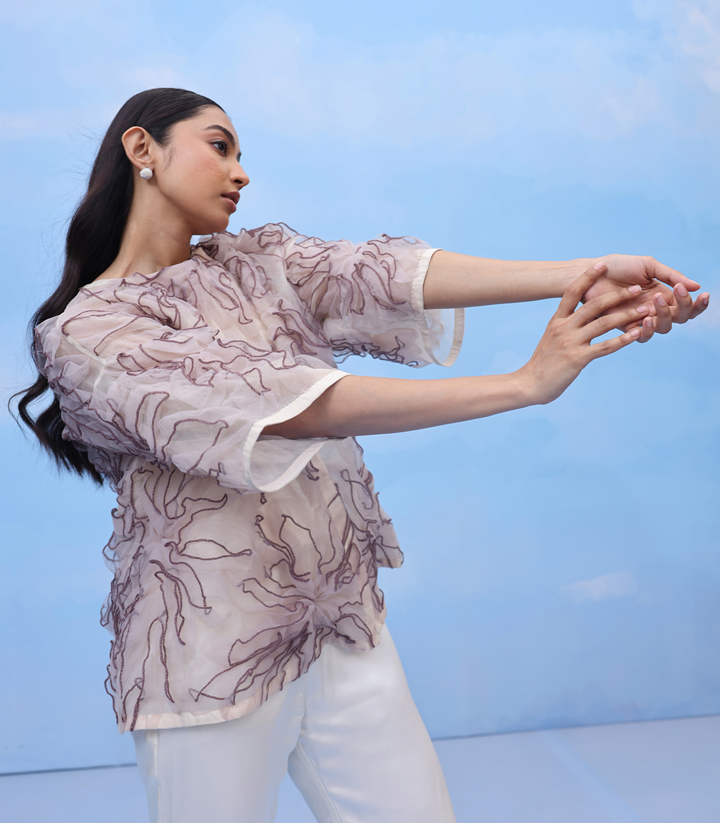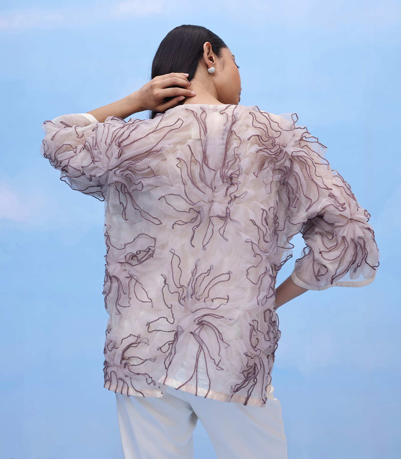 An oversized deconstructed shirt with petal patchwork on silk organza, featuring wide ball sleeves and side hidden button details for a versatile and dynamic look.