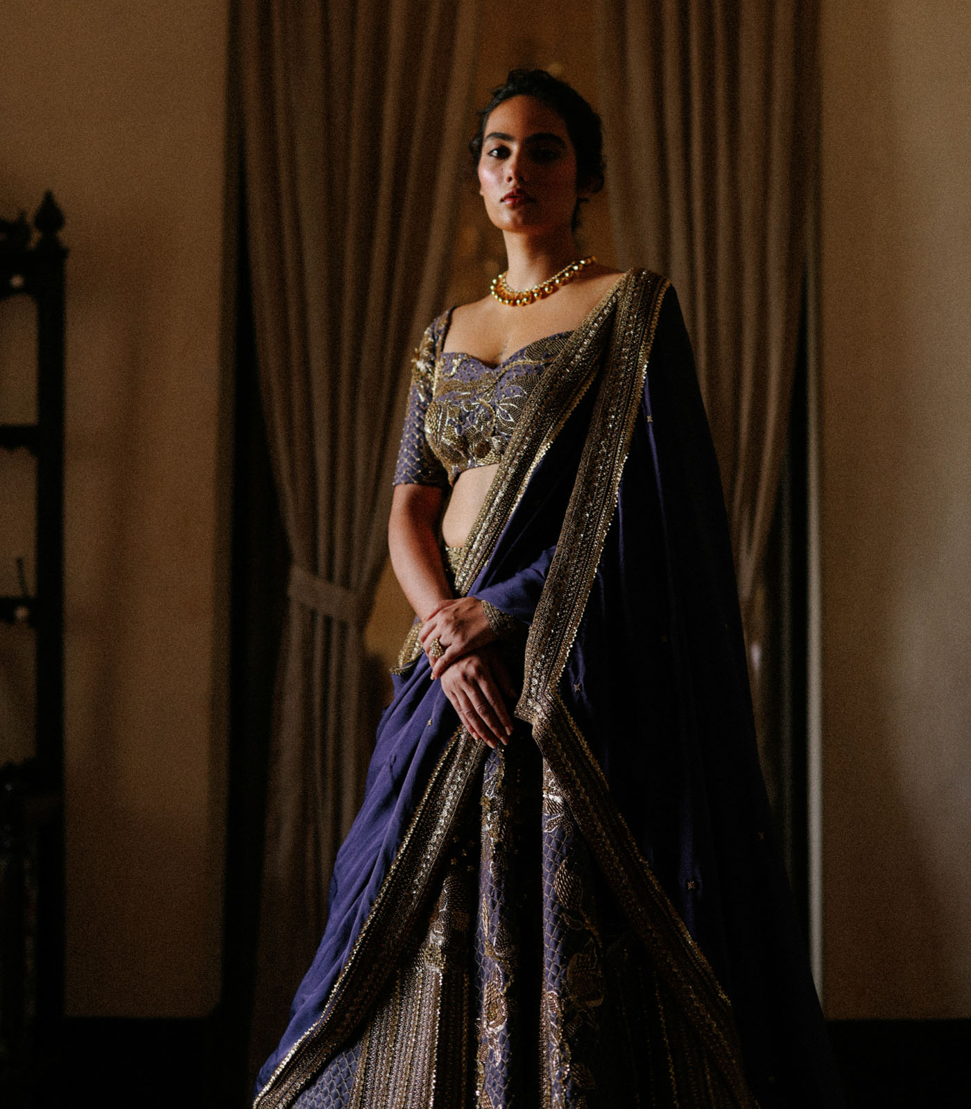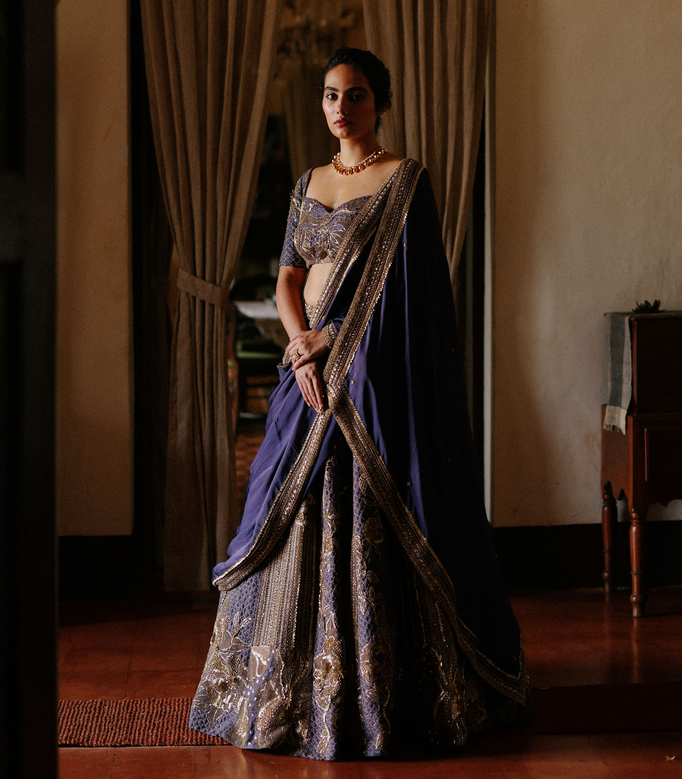 Our grape lehenga set is lavishly adorned with antique gold hand embroidery, covering the ensemble in exquisite detail. This stunning piece is complemented by our signature GK buckle, embodying a luxurious aesthetic.