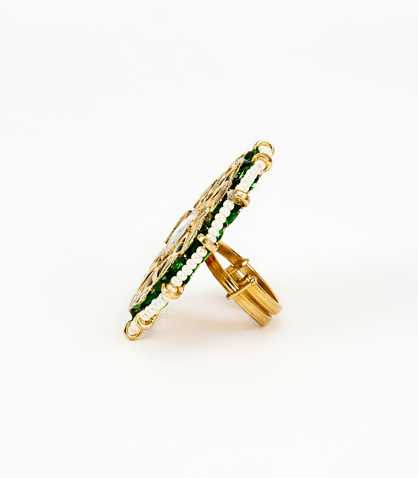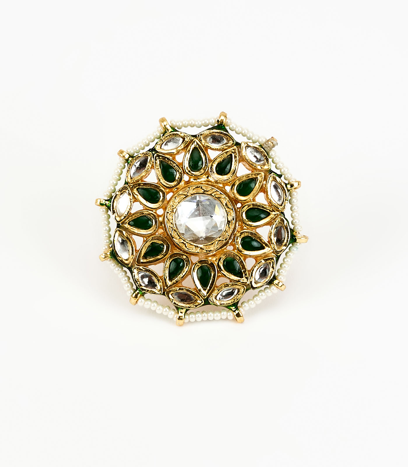 A regal round ring adorned with dazzling green & white gemstones, a central crystal & a delicate pearl border. Its intricate gold-toned design adds a luxurious touch to traditional and festive attire.