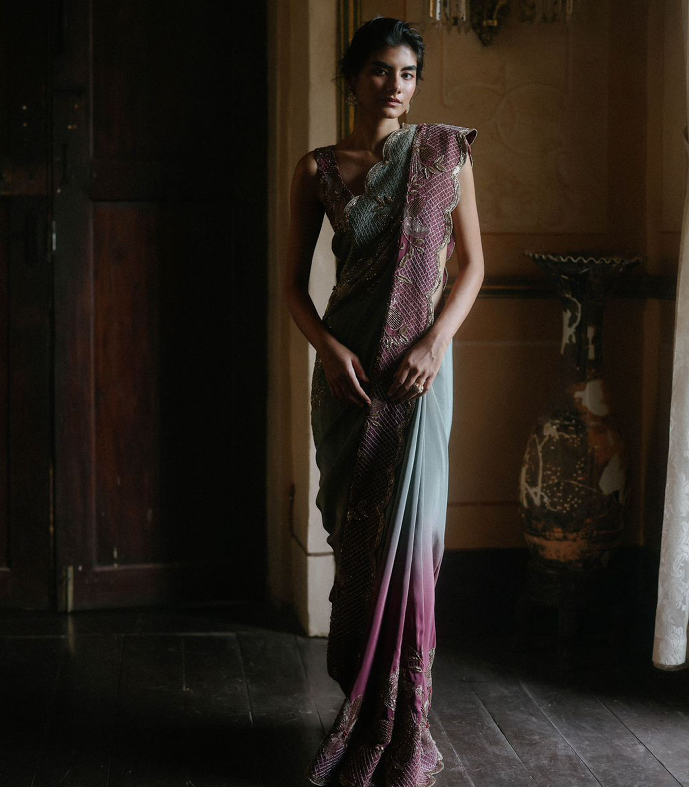 Our crimson moss ombre saree features elegant scallop edges and is intricately hand-embroidered with antique gold work throughout. This exquisite design combines timeless craftsmanship with a modern color gradient, making it a standout piece for any occasion.
