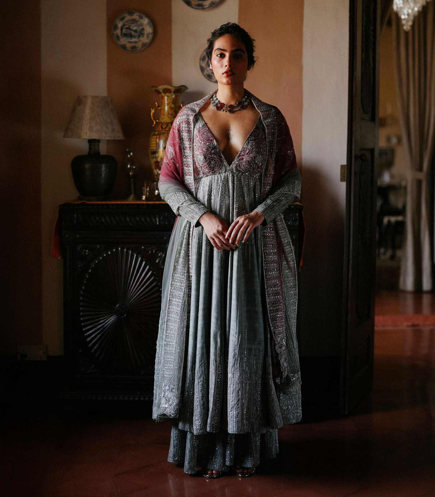 Elegant munga silk Anarkali set adorned with exquisite hand embroidery, featuring zari, threadwork, beadwork, and patchwork using scrap fabrics.