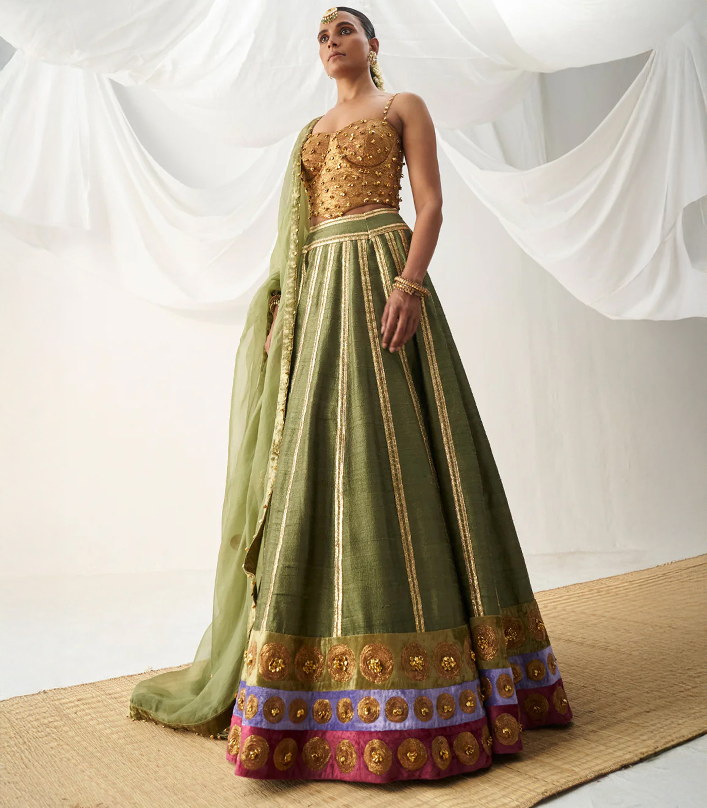 Antique embroidered corset paired with olive raw silk gota stripes lehenga which has dot embroidery on color blocked border.