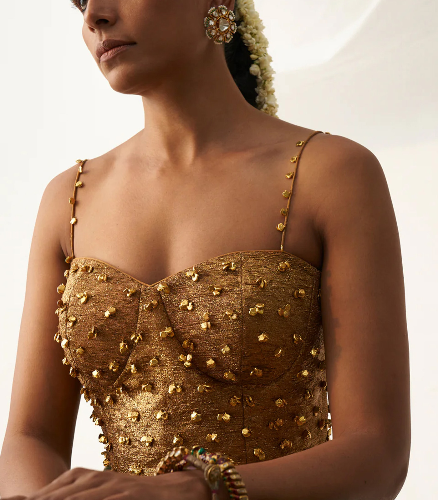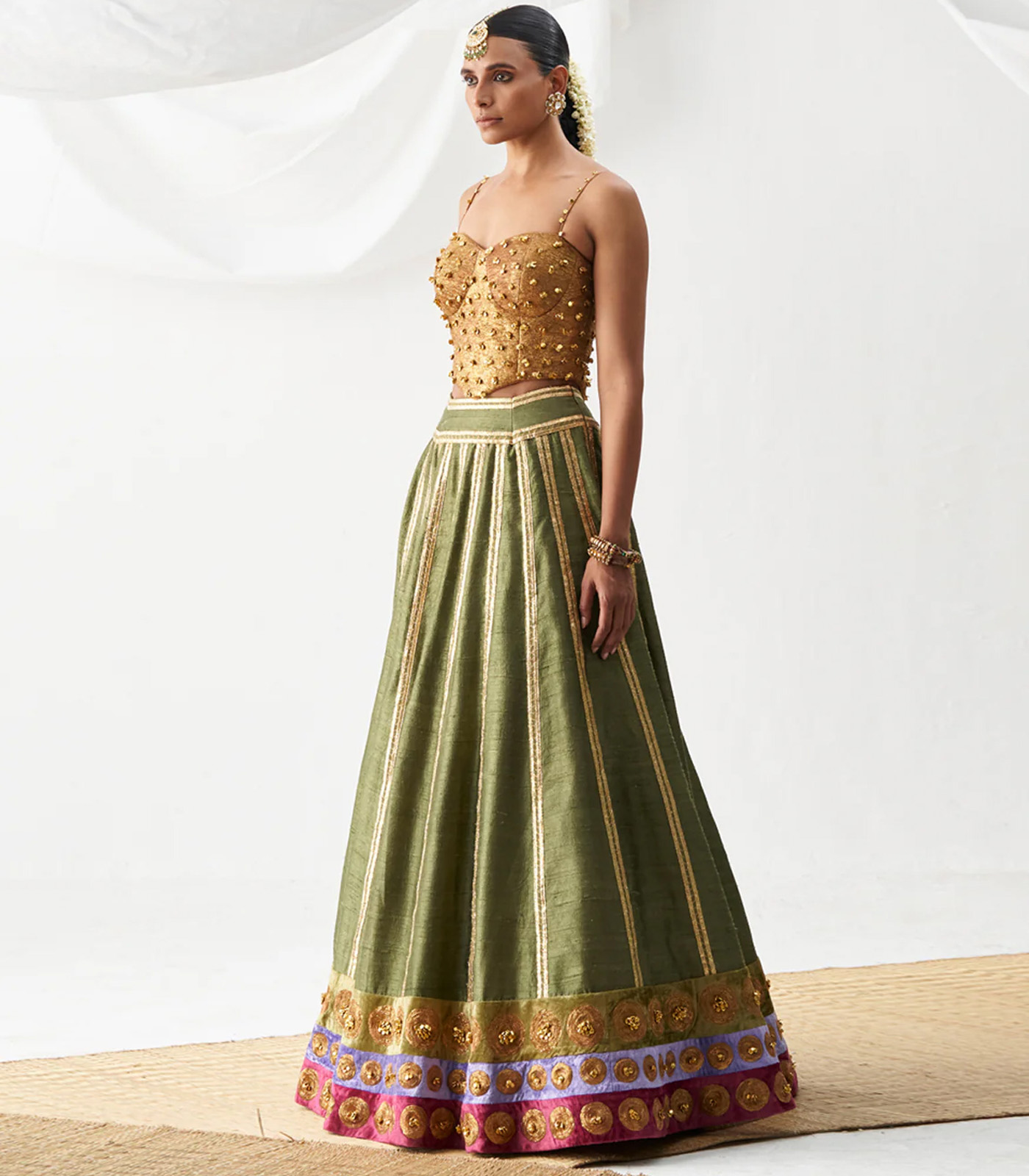 Antique embroidered corset paired with olive raw silk gota stripes lehenga which has dot embroidery on color blocked border.