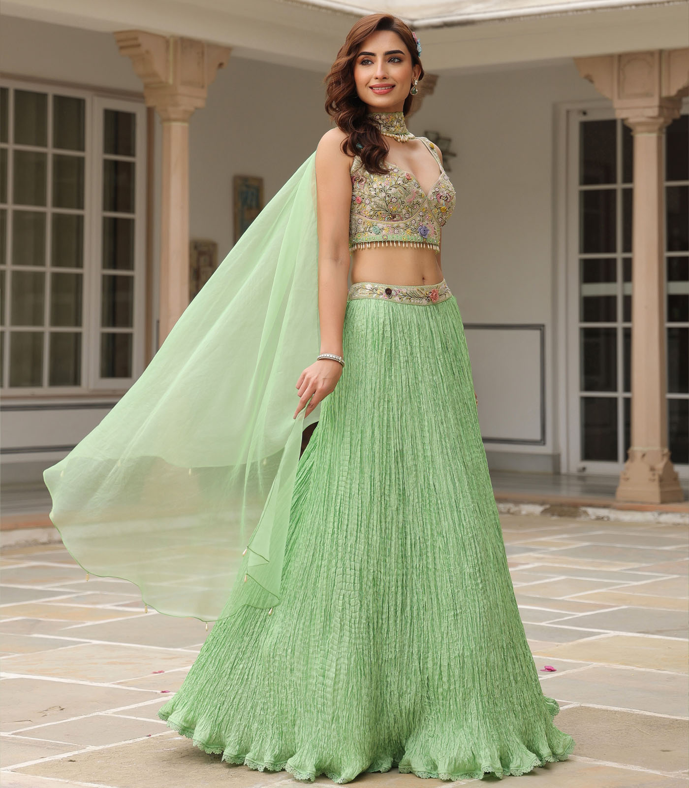 This 3 piece lehenga set comes with a heavy cutdana, beads and threadwork embroidered blouse enhanced with handmade 3d flowers and pearl hangings at the hem. The silk lehenga skirt is hand crushed and enhanced with an embroidered waist belt and handmade tassels. It is paired with a choker style dupatta enhanced with cutdana, beads and threadwork embroidery with pearl hangings.